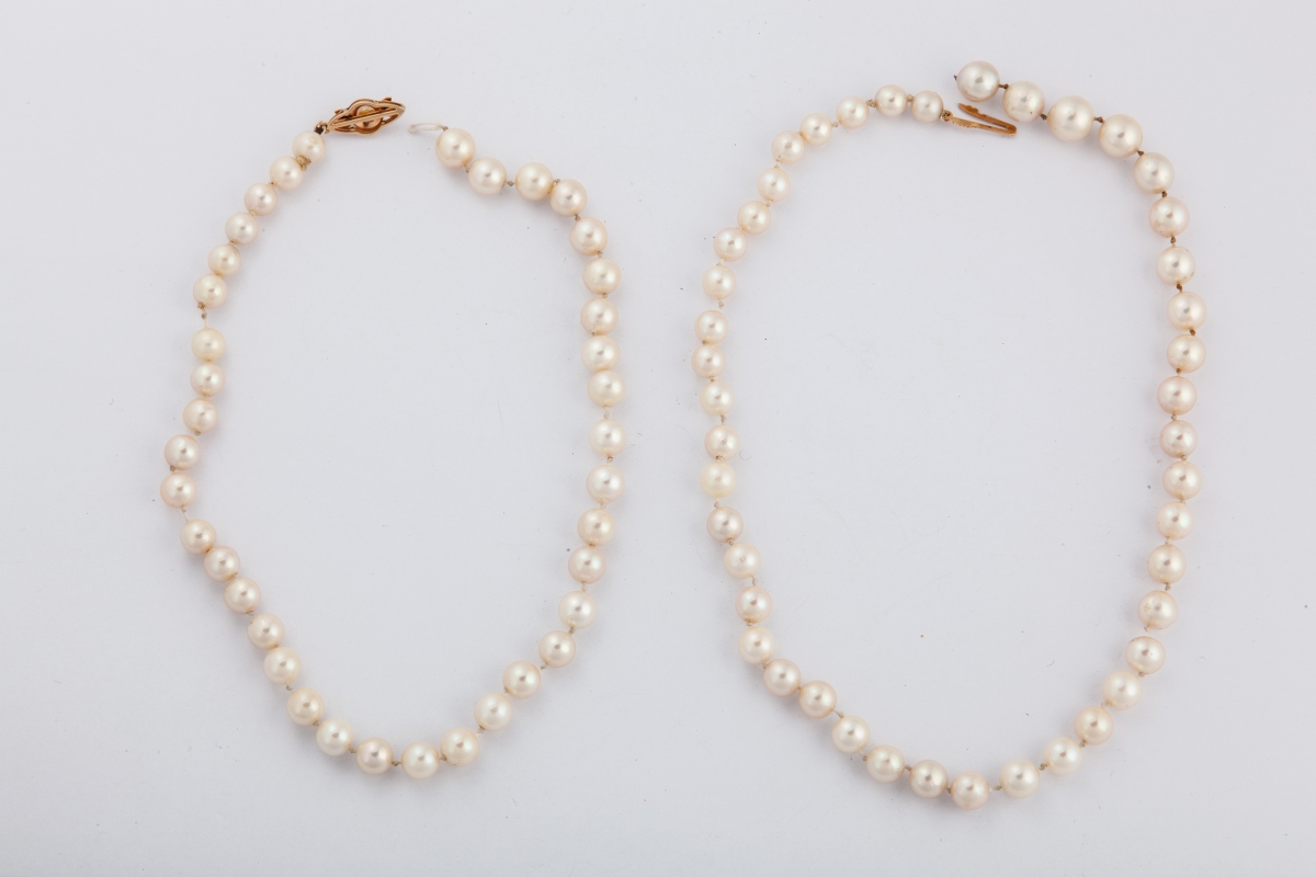 COLLIER de 82 PERLES, le fermoir en or est agrémenté d'une perle et encadré de motifs feuillagés. Long. 82 cm.