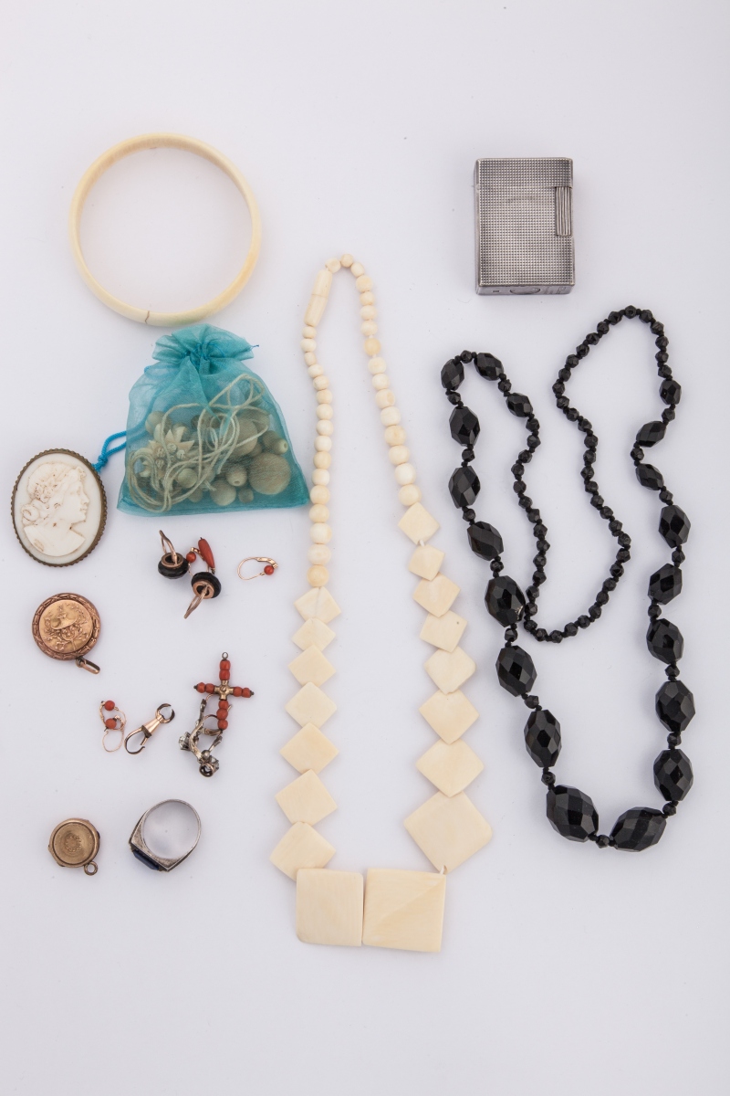 BIJOUX VARIA : collier ivoire, verre noir, bracelet ivoire, briquet Dupont métal argenté, corail, pendentif, bague pierre bleue, broche paires de boucles d'oreille...