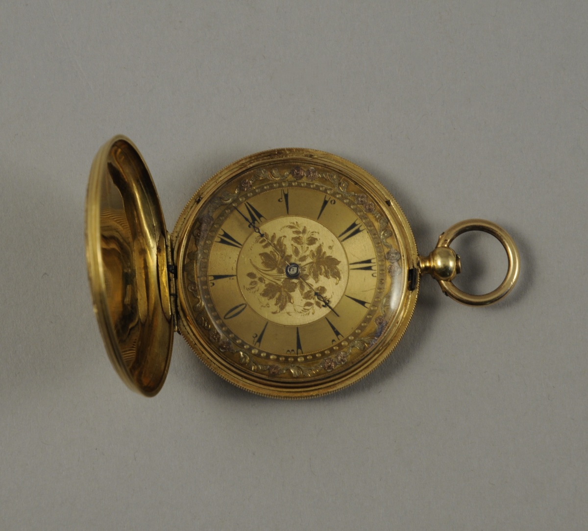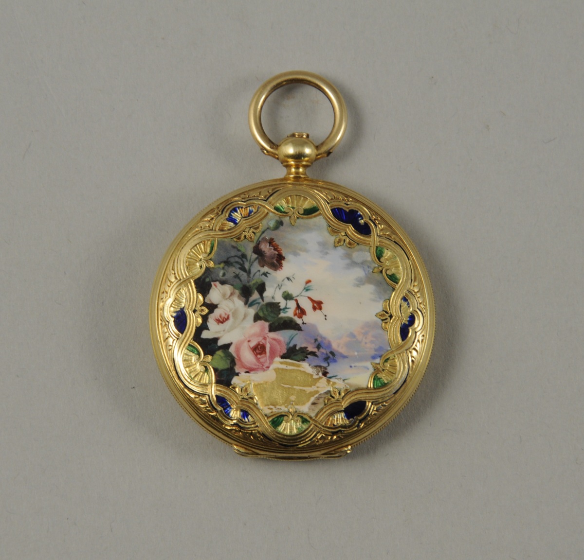 MONTRE de POCHE savonnette en or jaune, pour le marché ottaman, le cadran en chiffres indo-arabes. La boîte est ciselée d'un décor floral sur fond d'émail bleu et vert, figurant sur une face un bouquet de fleur devant un lac, et sur l'autre d'un bouquet de fruits. Remontage à clé. Signée HOURIET n° 23869. Travail suisse, vers 1830. Clé en laiton.