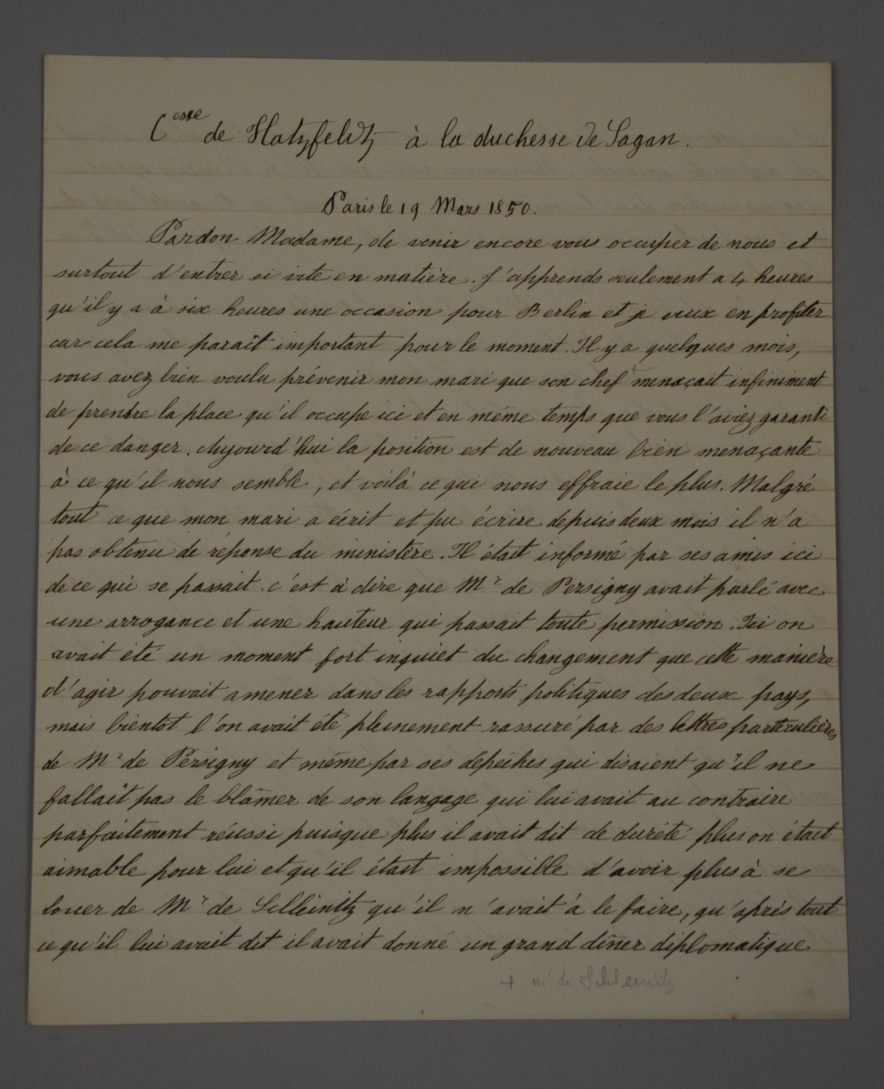 Intéressante correspondance à la duchesse de Sagan, avec transcription dactylographiée, commentant la révolution de Février et ses suites, évoquant de nombreux hommes politiques (Persigny, Molé, Thiers, Berryer, " le maître Louis ", etc.), puis le Deux-Décembre (long témoignage), le décret contre les Orléans, l'arrivée de " la Sultane ", les fêtes à la Cour, les réceptions du Corps diplomatique, les nouvelles du roi de Prusse et de Berlin