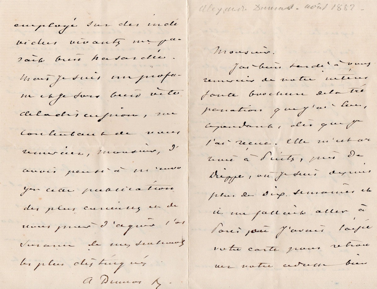ALEXANDRE DUMAS fils. - L.A.S. adressée au baron de Baye.