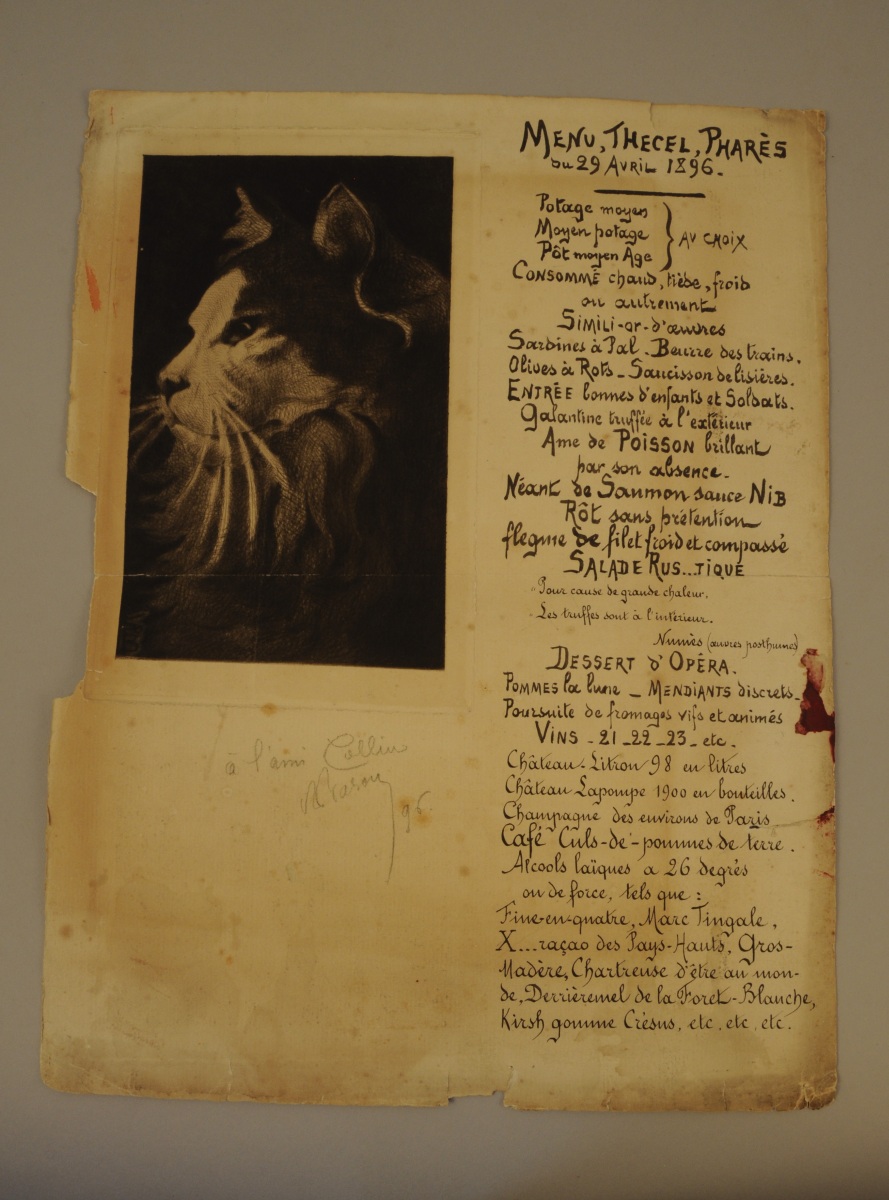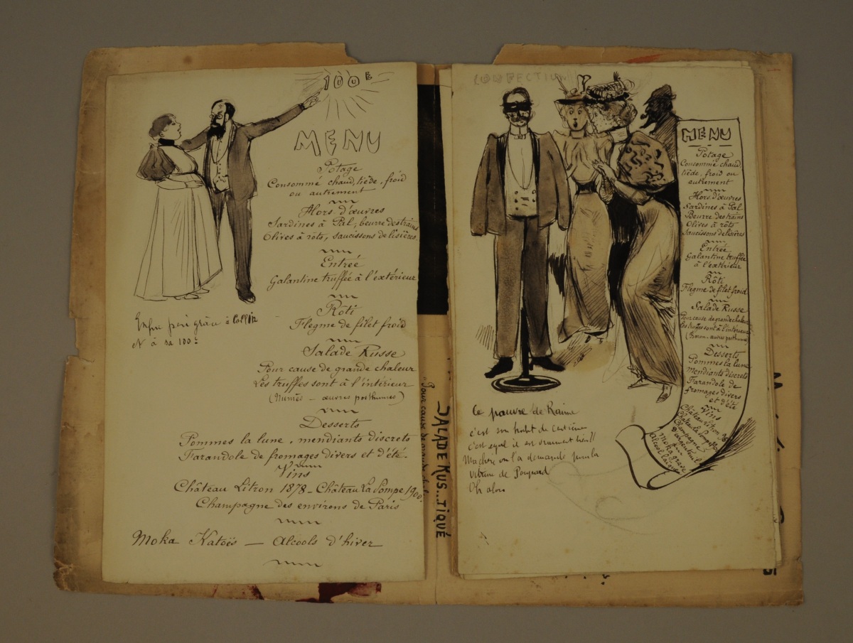 - Ensemble de MENUS humoristiques accompagnés de dessins à l'encre. L'un accompagné d'une gravure représentant une tête de chat. 10 feuilles. Un signé "Maray" (?), un autre "P. de Raine" (?). Vers 1900. Le plus grand, 36 x 27,5 cm. (usures, déchirures)