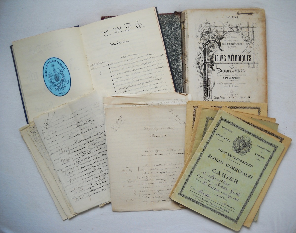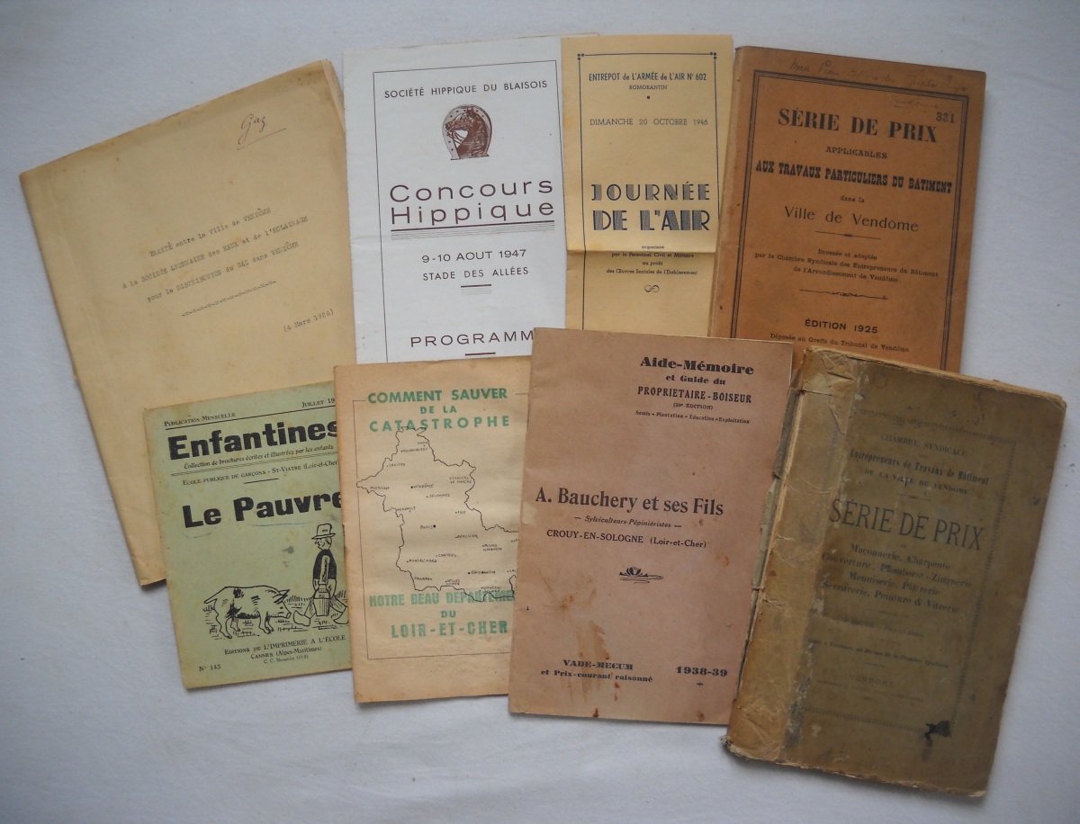 JOINT : lot de documents divers : plaquette pépiniériste, prix entrepreneurs de travaux de batiments de la ville de Vendôme (1893 et 1925) ; tract électoral Bernard Paumier 1953 ; programme théâtre Journée de l'air à romorantin 1946 ; programme concours hippique de Blois 1947 ; couplet chantés à la fête donnée à la garnison de Blois (Restauration) ; extrait cadastral commune de Lisle 1844 ; " Le Loir-et-Cher maçonnique " + programme assemblée générale association antimaçonnique de France début XXe ; 6 cahiers d'écolier de Saint Amand de Vendôme, 1919 ; collège Augustin Thierry, exercices de latin, anglais, mathématiques, 1873 ; cahier cours d'instruction religieuse du pensionnat des Ursulines de Blois, fin du XIXe siècle ; volume des recueils de chants du pensionnat des Ursulines ; brochure école de garçons de St Viatre