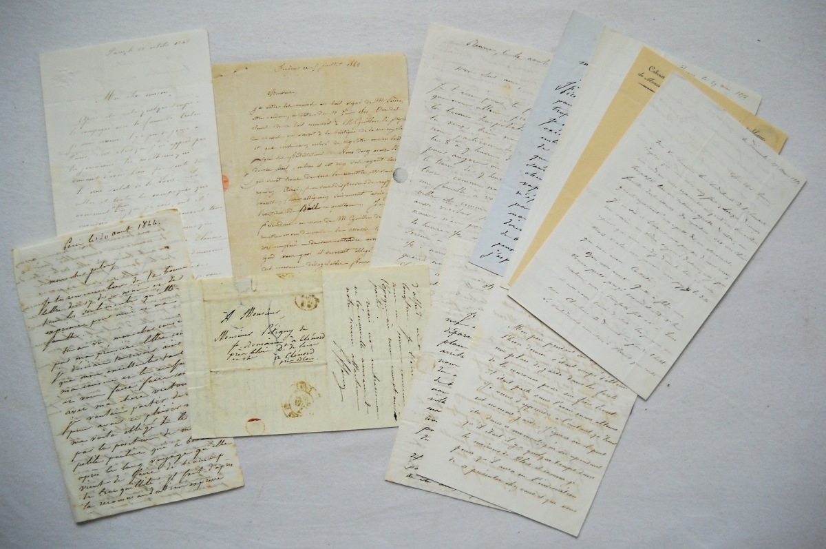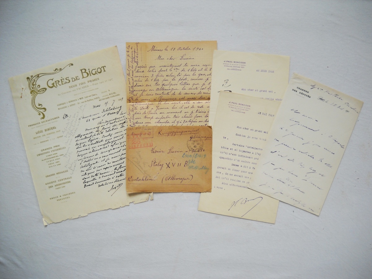 Lot de 50 lettres : lettre de M. Fratini aide major au 28e de ligne en garnison à Blois (octobre 1844) ; 14 lettres famille Desvaux-Lousier à Mondoubleau (conseiller général sous la Monarchie de Juillet), 1827-1854 ; lettre M. de Seignelei, juré d'assises à Blois, écrit à sa mère (1827) ; lettre de St Pern marchand commissionnaire de vins (1747), cachet de cire ; 17 lettres du XIXe siècle dont famille de MAUPAS (1810), Augustin THIERRY, BIGOT céramiste ; lettre écrite de Menars en octobre 1940 adressée à un prisonnier français au stalag XVII B ; 11 lettres adressées à Jules de Pétigny années 1840-1850 ; 3 lettres de J. Paul Boncour.