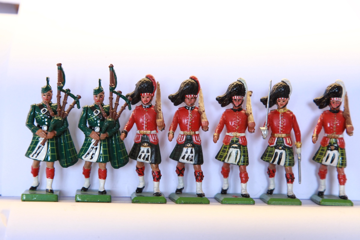 BRITAINS, Grande-Bretagne. The Highlands Regiments. 18 figurines : 7 à tartan noir, 7 à tartan vert, 4 joueurs de cornemuses.