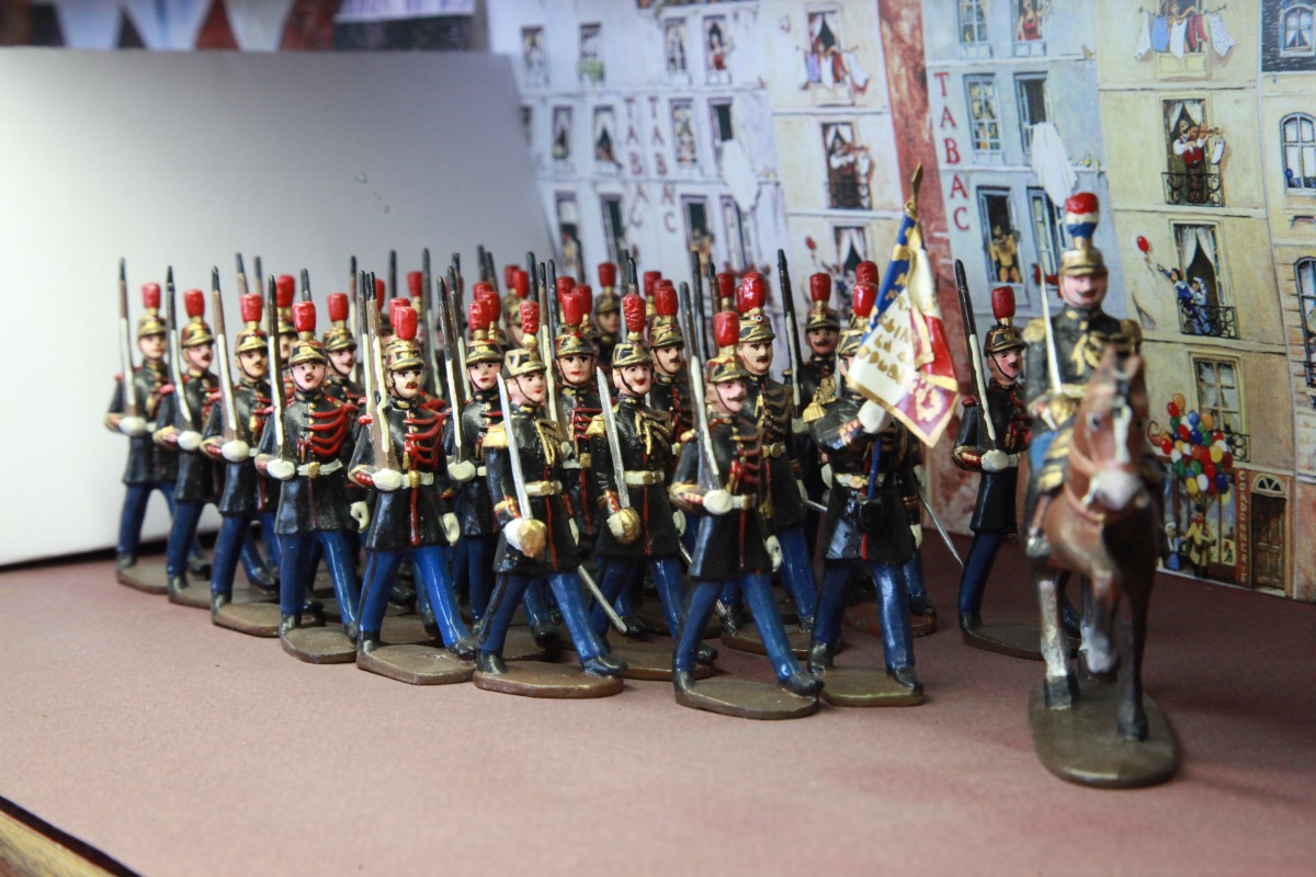 France. 33 figurines de la Garde Républicaine : Peloton défilant à pied fusil sur l'épaule, 1 officier à cheval, 32 Fantassins. Epoque : Défilé de la Victoire, 1919.