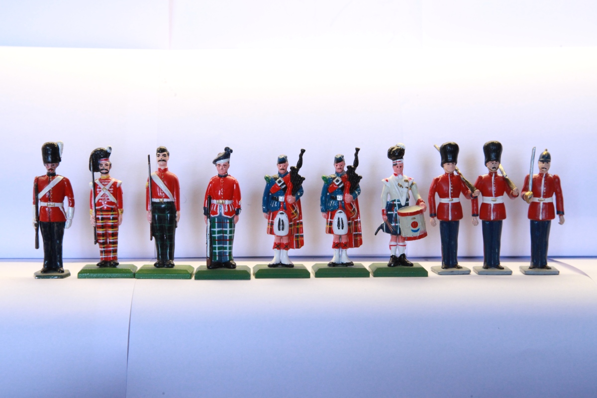 William Grant & sons LTD, Grande-Bretagne. 10 figurines : 4 Guards, 6 écossais socle vert [William Grant & sons LTD]. Epoque : Trooping the Colour.