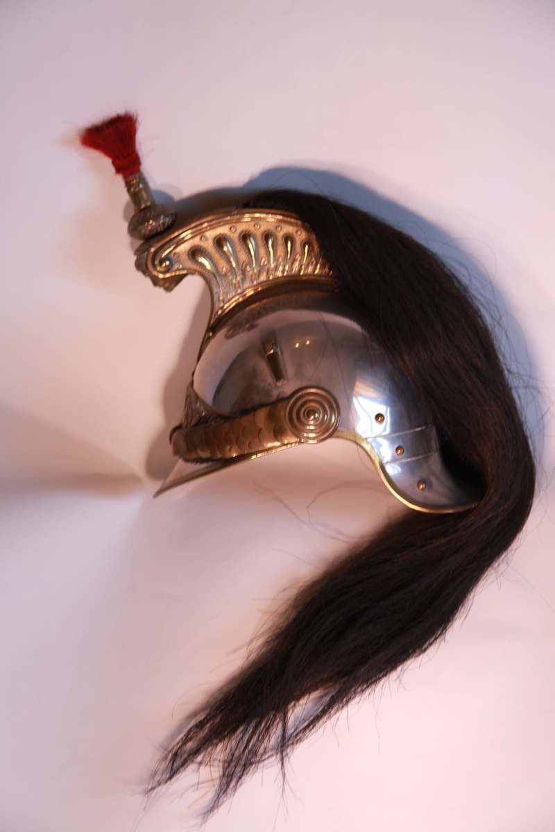 CASQUE OFFICIER GARDE REPUBLICAINE. Bandeau aux Armes de Paris (avec légion d'honneur). Cimier laiton doré. Crinière crins noir. Plumet écarlate. Jugulaires écaille. Complet avec sa coiffe et ses cuirs intérieurs. Modèle 1872.