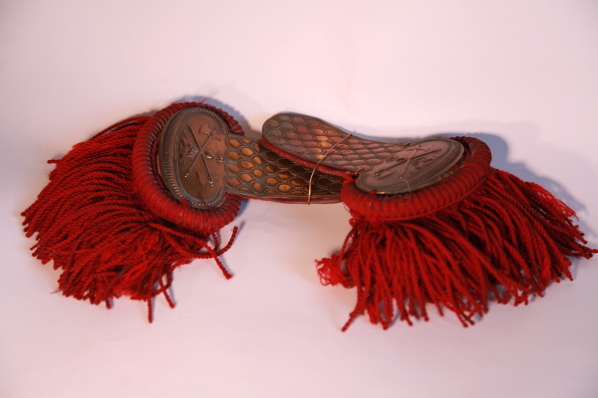EPAULETTES POMPIER. Franges écarlates. Métal estampé. Début 19ème siècle.
