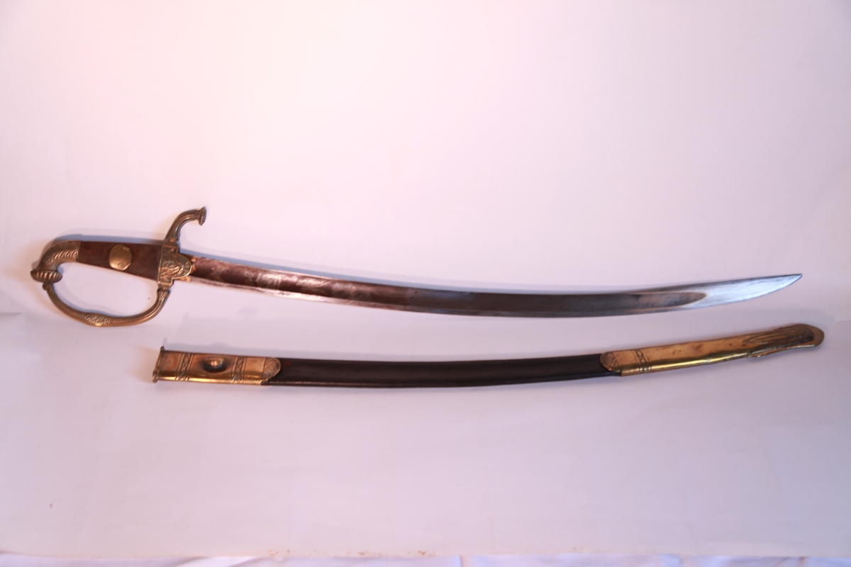 SABRE OFFICIER de troupes à pied. Garde portant à sa base le blason de la maison de Condé. Lame bleuie et gravée au tiers (blason de Condé surmontée du chiffre 10). Chappe et bouterolle laiton gravée fourreau cuir. 19ème siècle.