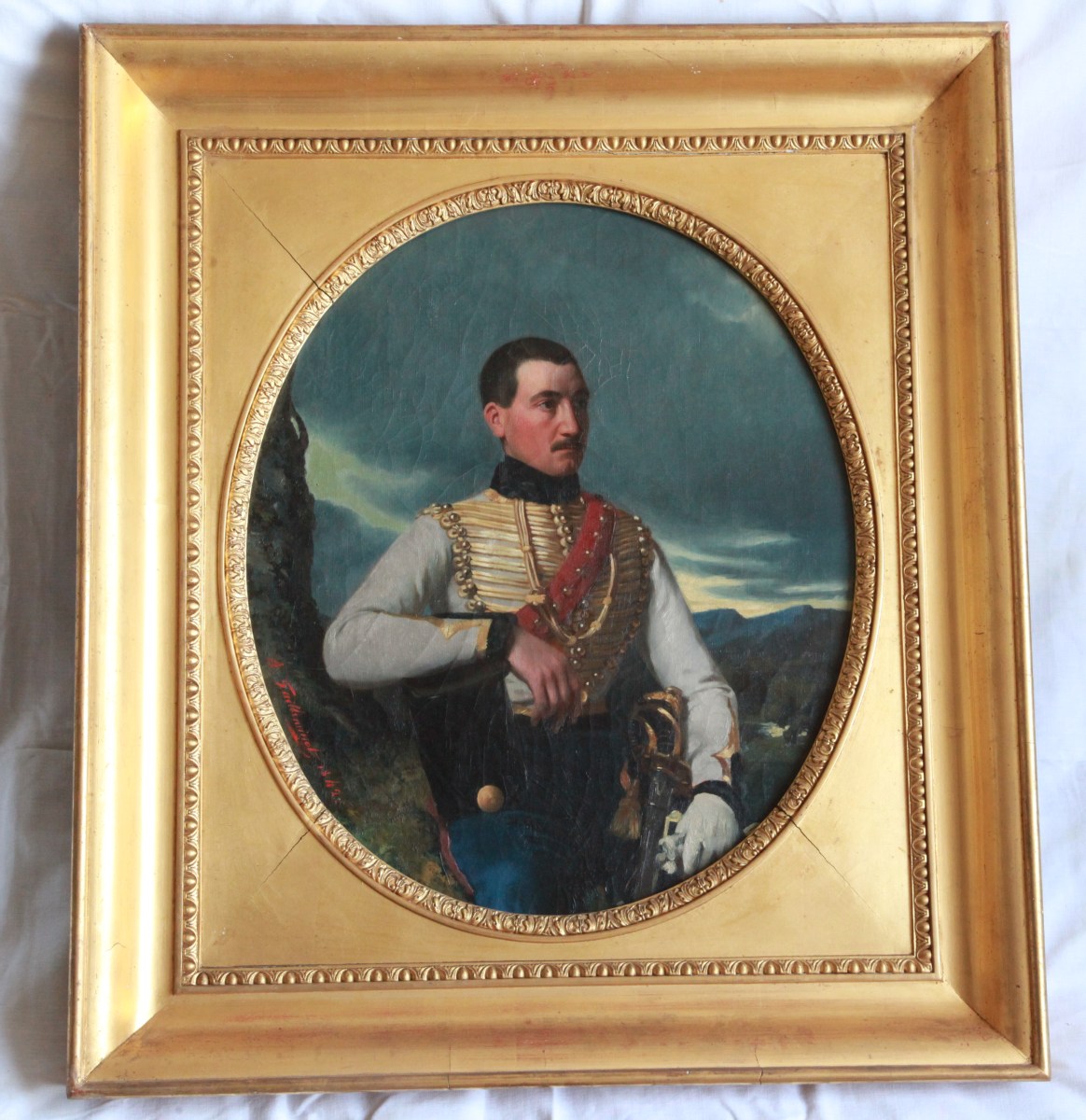 Inscription en rouge au revers du tableau "Officier 8ème hussard à 26 ans en 1842".