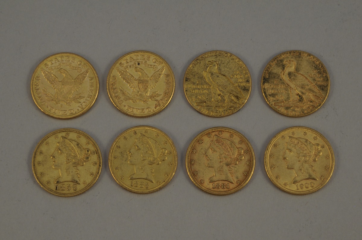 ETATS UNIS. 8 pièce 5 $ or :1856, 1881, 1886 (2), 1887, 1900, 1911 (Indien) et 1914 (Indien). TTB
