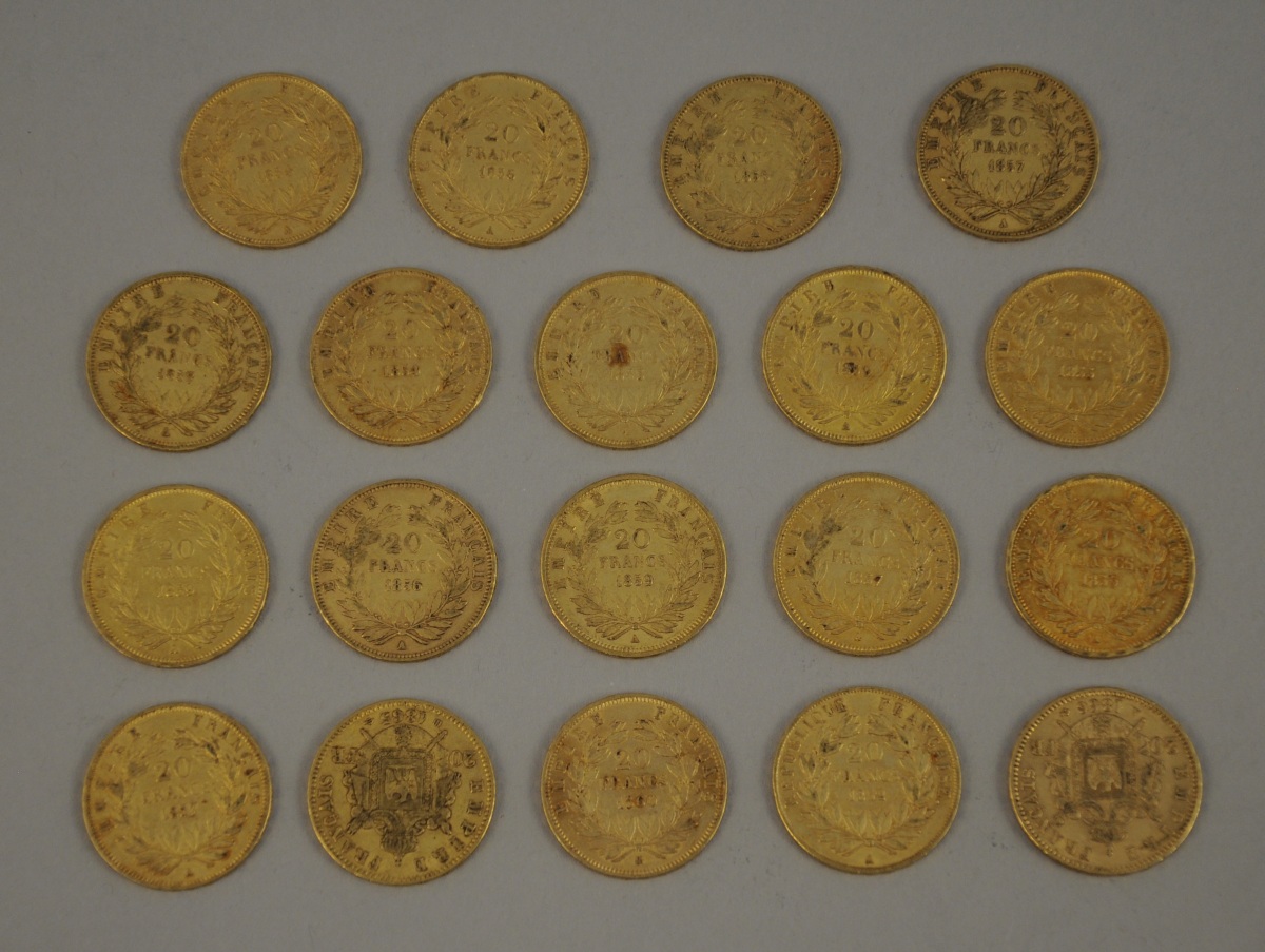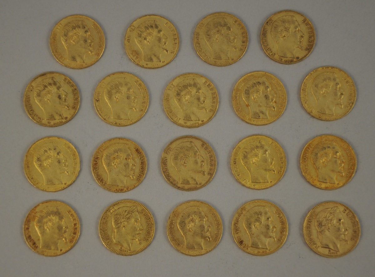 FRANCE. 20 F or x 19 : 17 Napoléon III non lauré, 2 Napoléon III lauré. TTB.