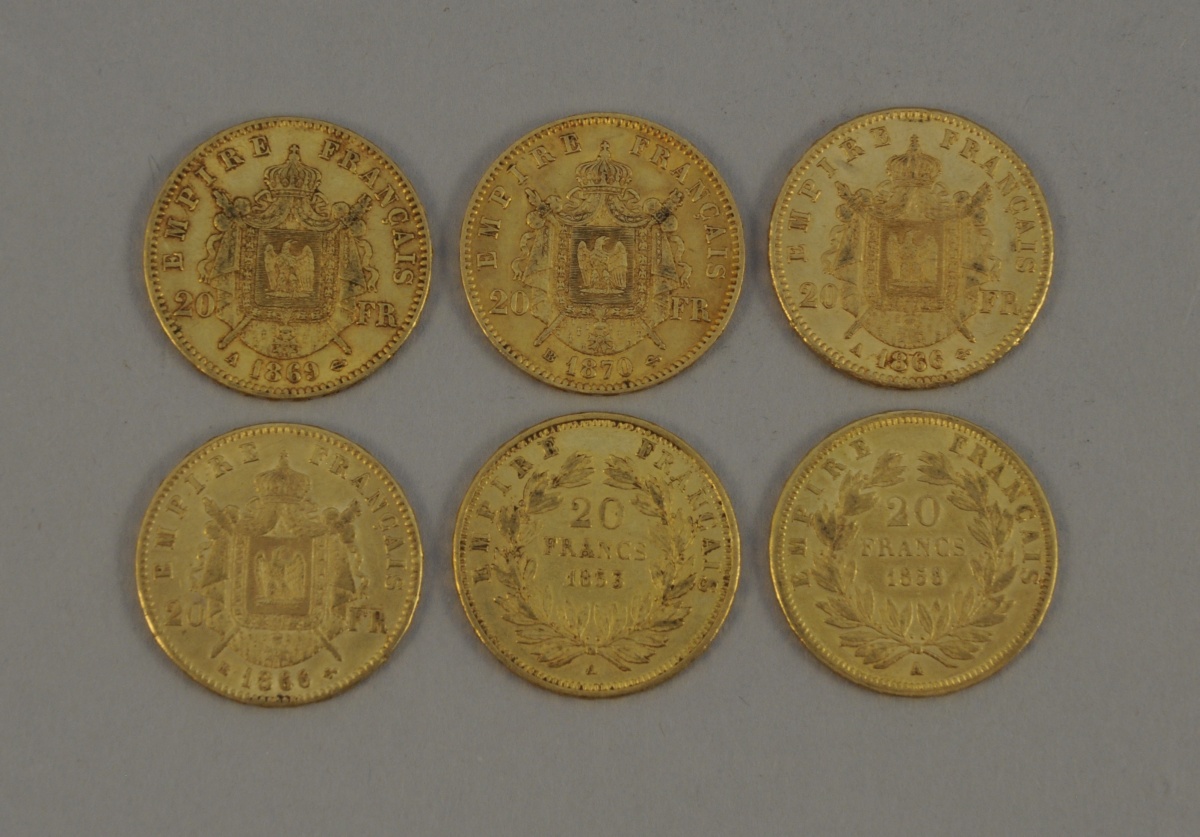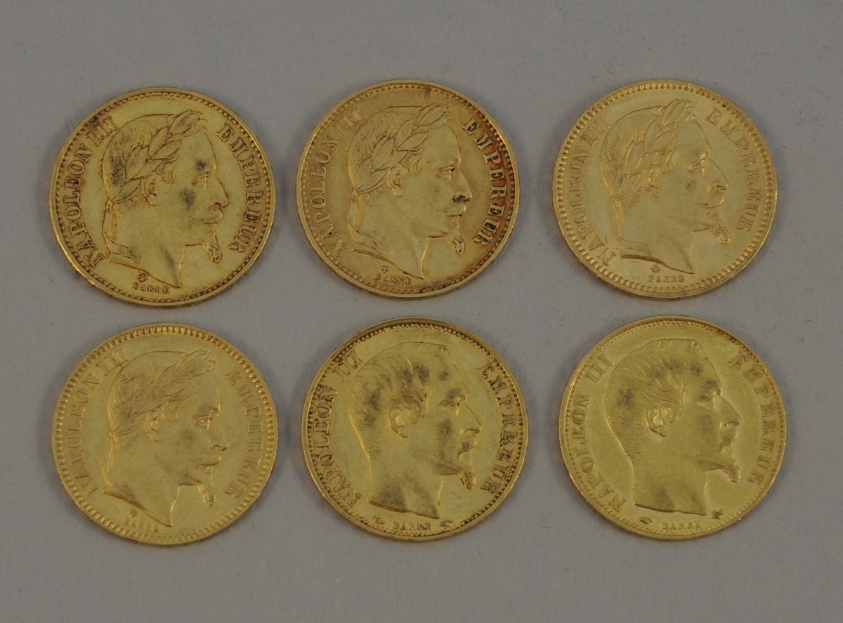 FRANCE. 6 pièces 20 F or Napoléon III : 1853, 1858, 2 x 1866 (lauré), 1869 (lauré), 1870 (lauré). TTB