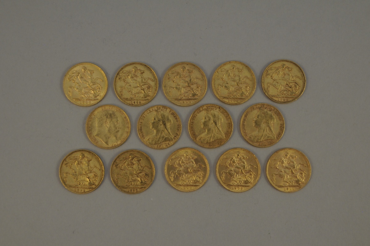 GRANDE BRETAGNE. 14 pièces Souverain or : 7 Victoria 1892 (2), 1893 (2), 1894 (1), 1899 (2). 7 Edouard VII. TB.