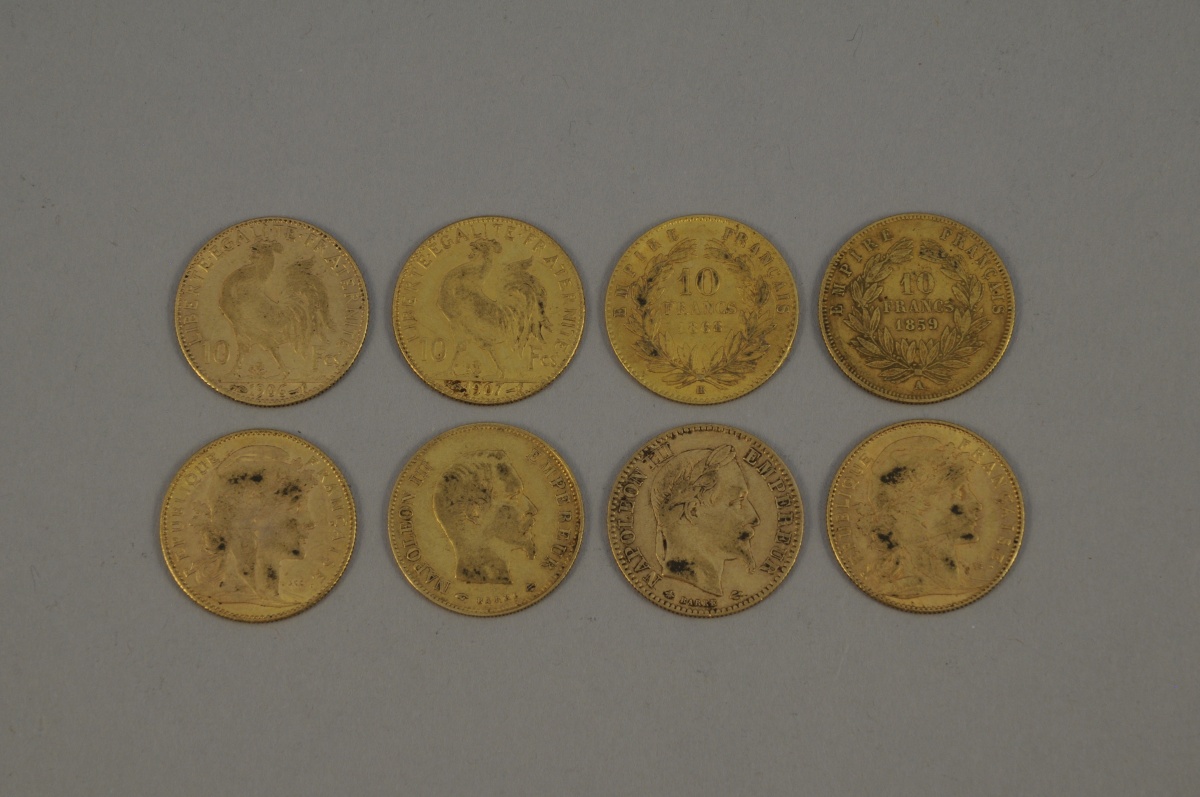 FRANCE. 8 pièces 10 F or : Napoléon III, Coq....