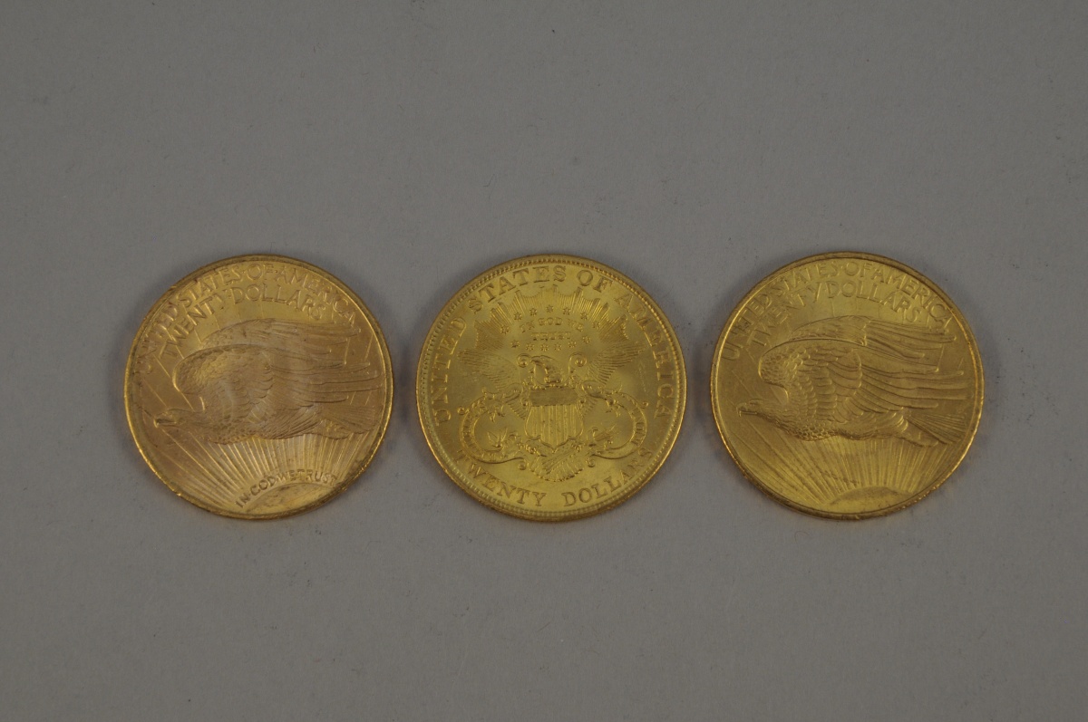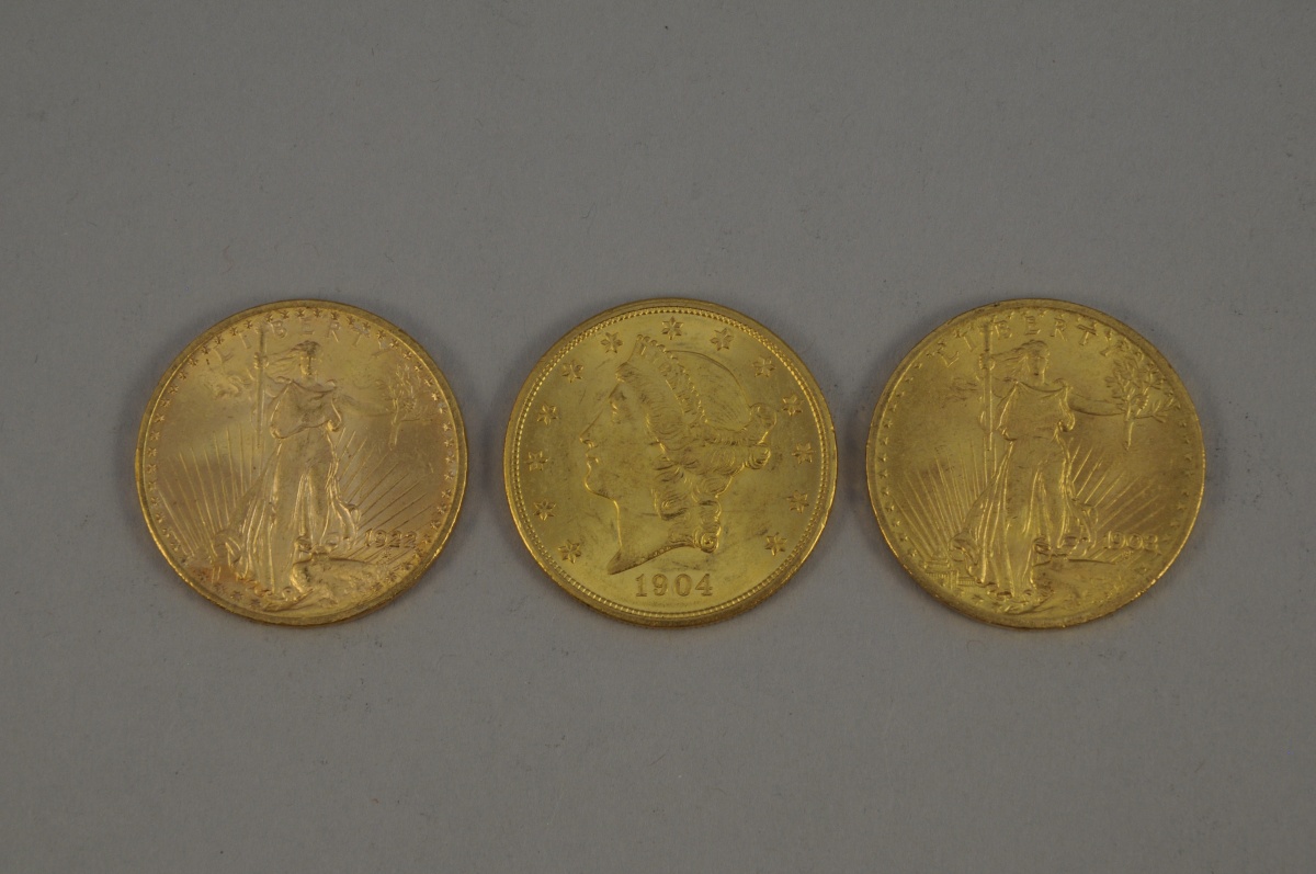 ÉTATS-UNIS. 3 pièces de 20 $ or : Eagle (1908, 1922) et Liberty (1904). TTB. SUP.