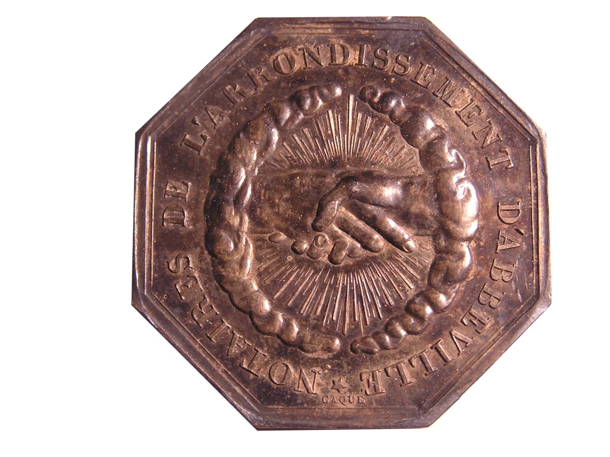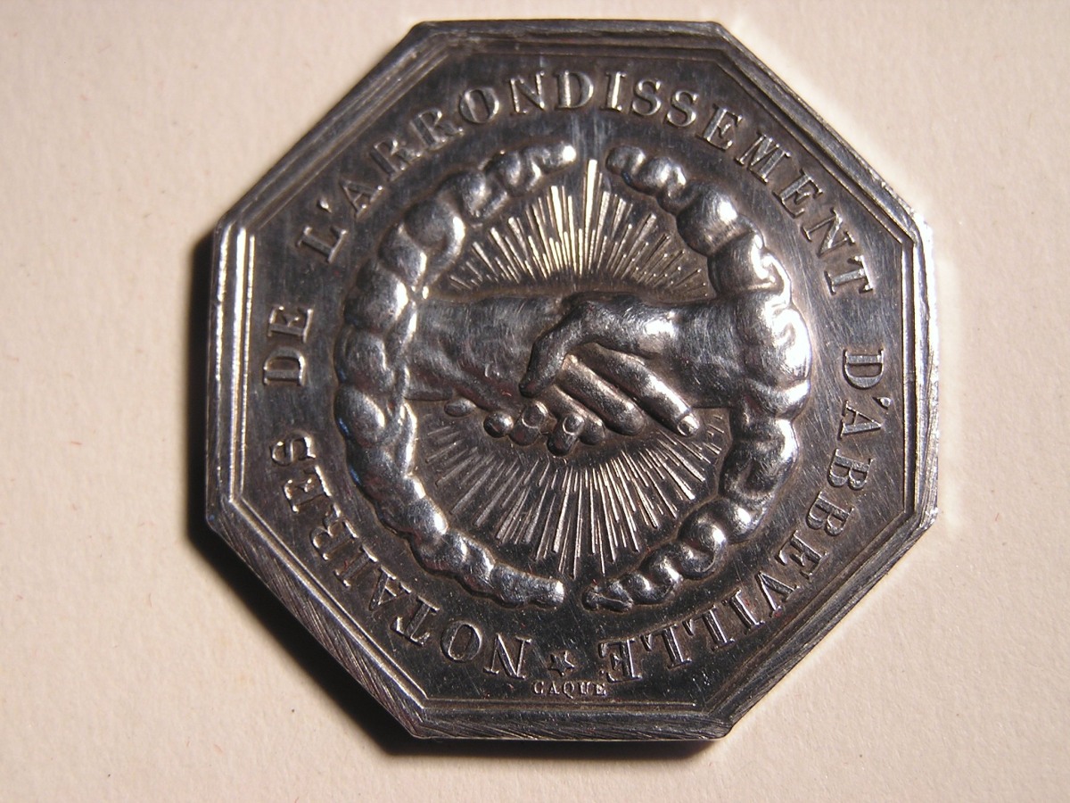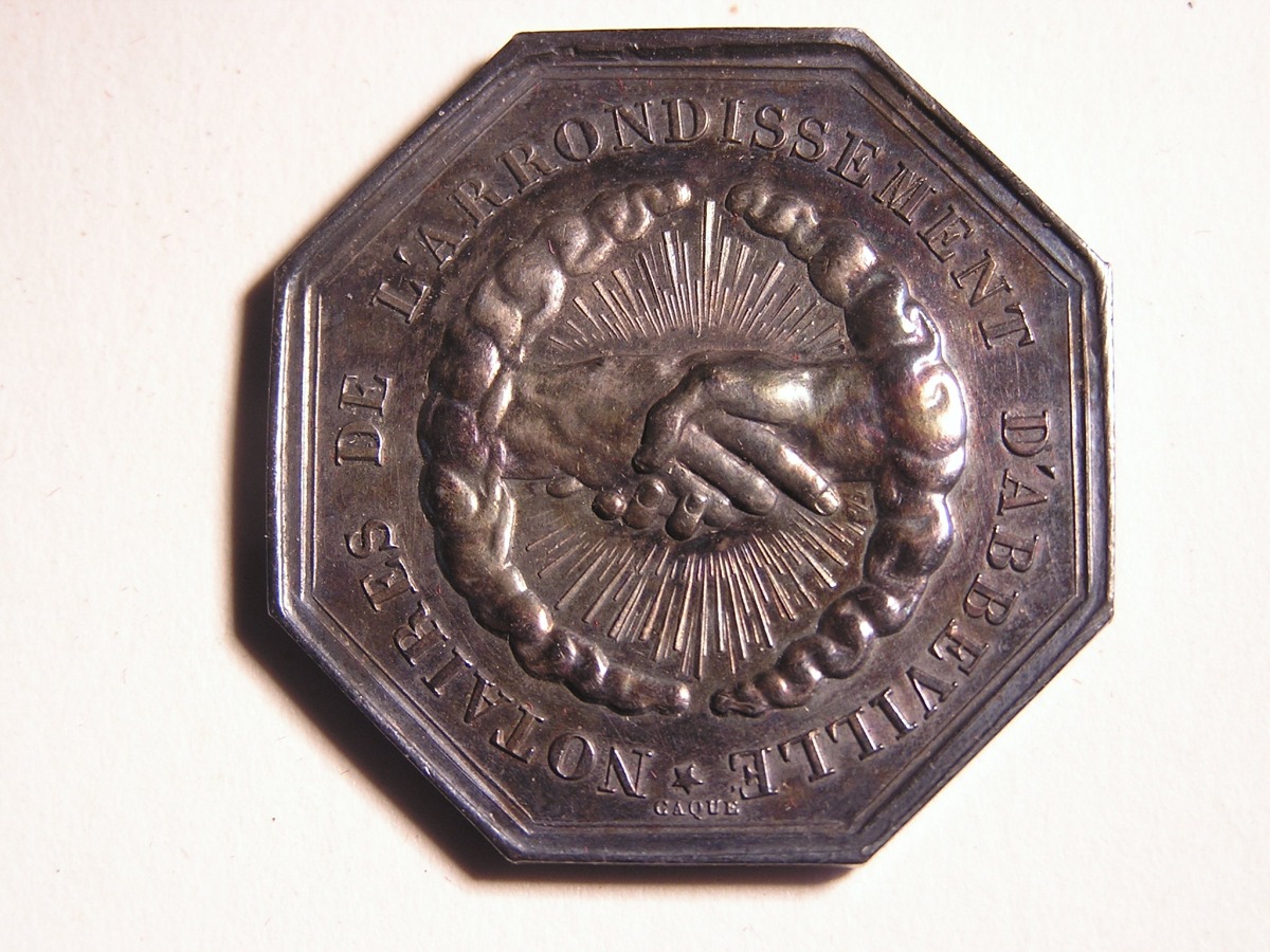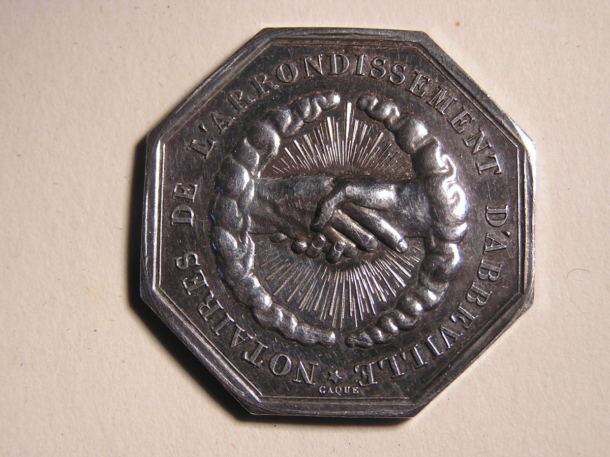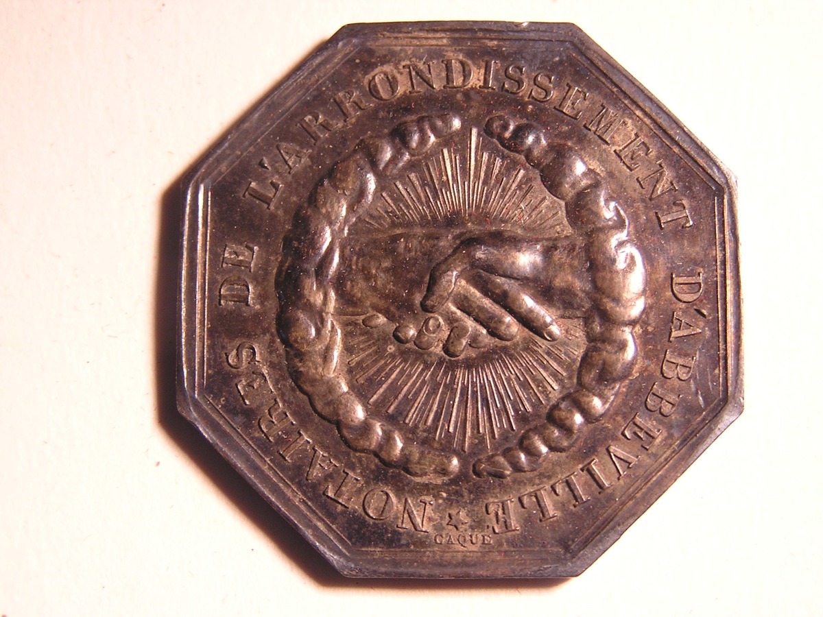 ABBEVILLE. 7 Jetons de notaires en argent, de forme octogonale et circulaire.