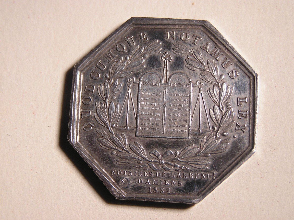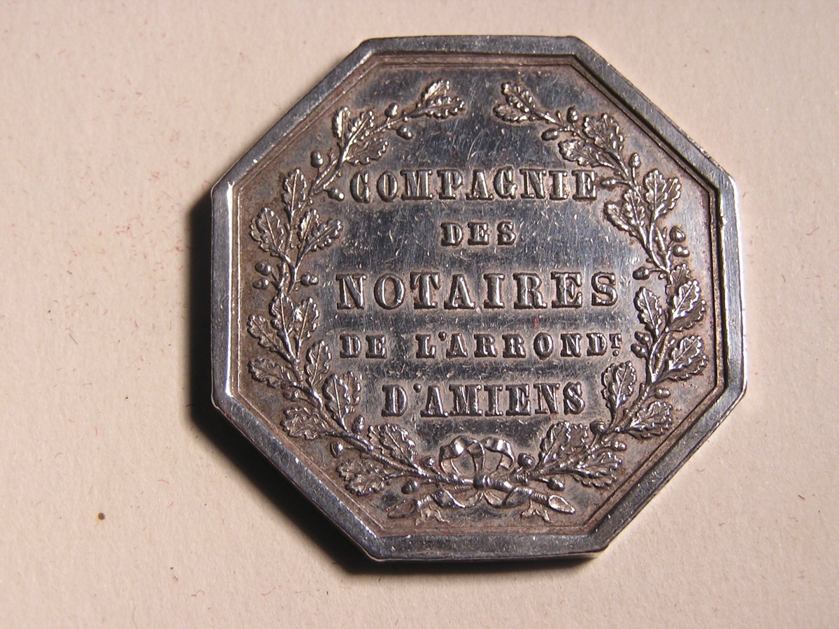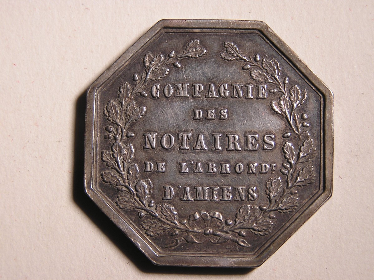 AMIENS. 12 Jetons de notaires en argent, en bronze et en cuivre, de forme octogonale et ronde.
