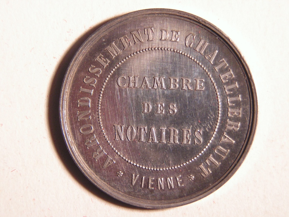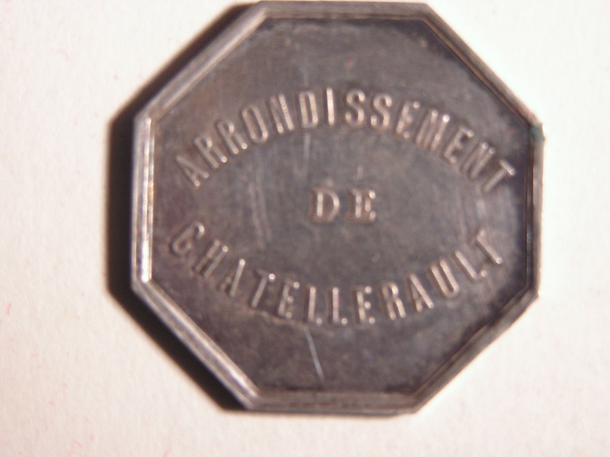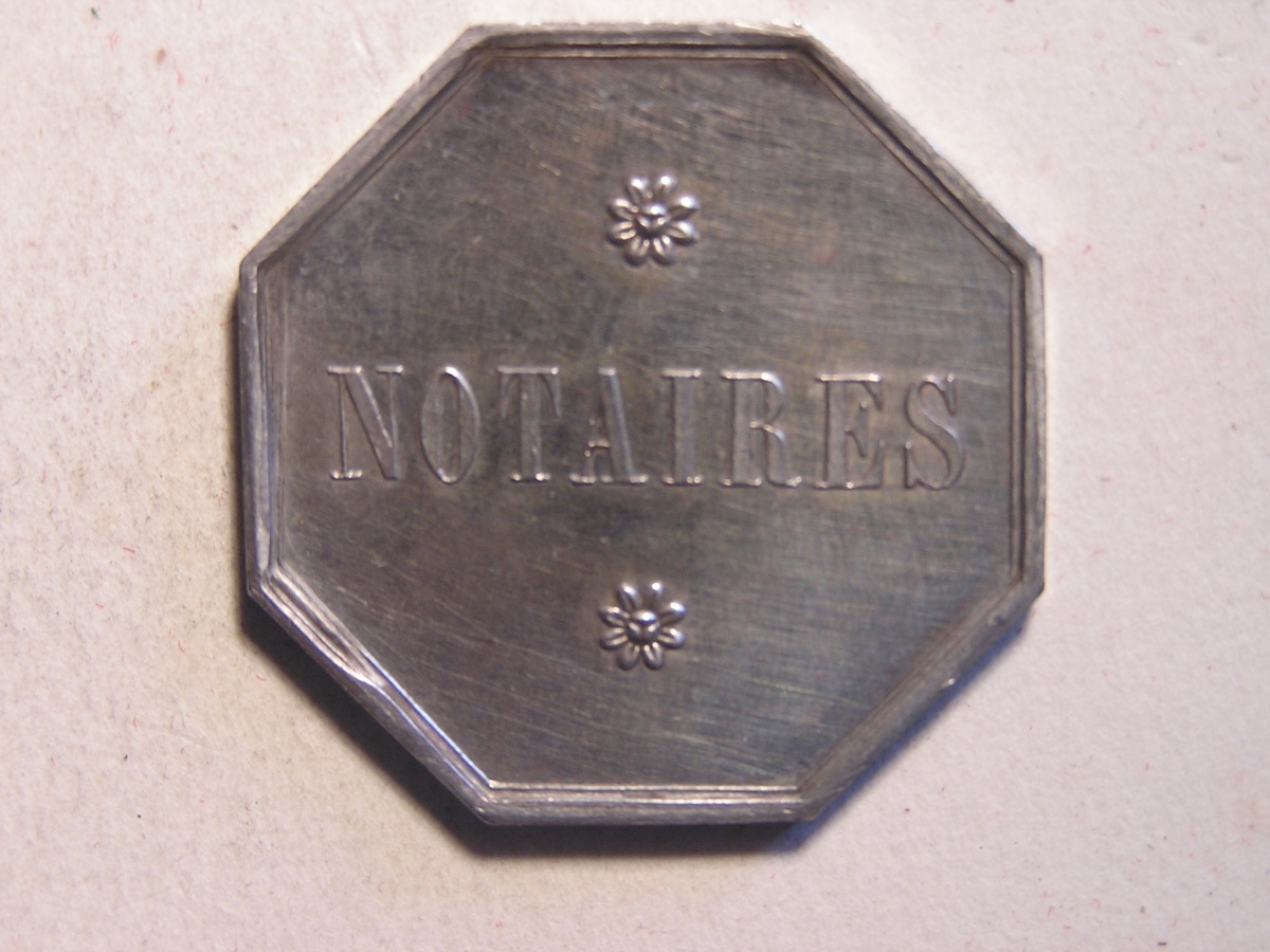 CHATELLERAULT. 2 Jetons de notaires en argent, de forme octogonale et ronde.