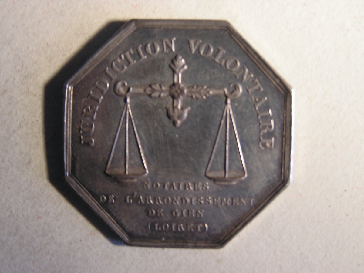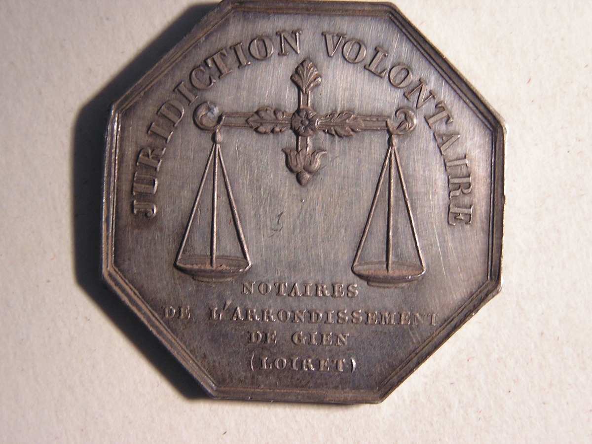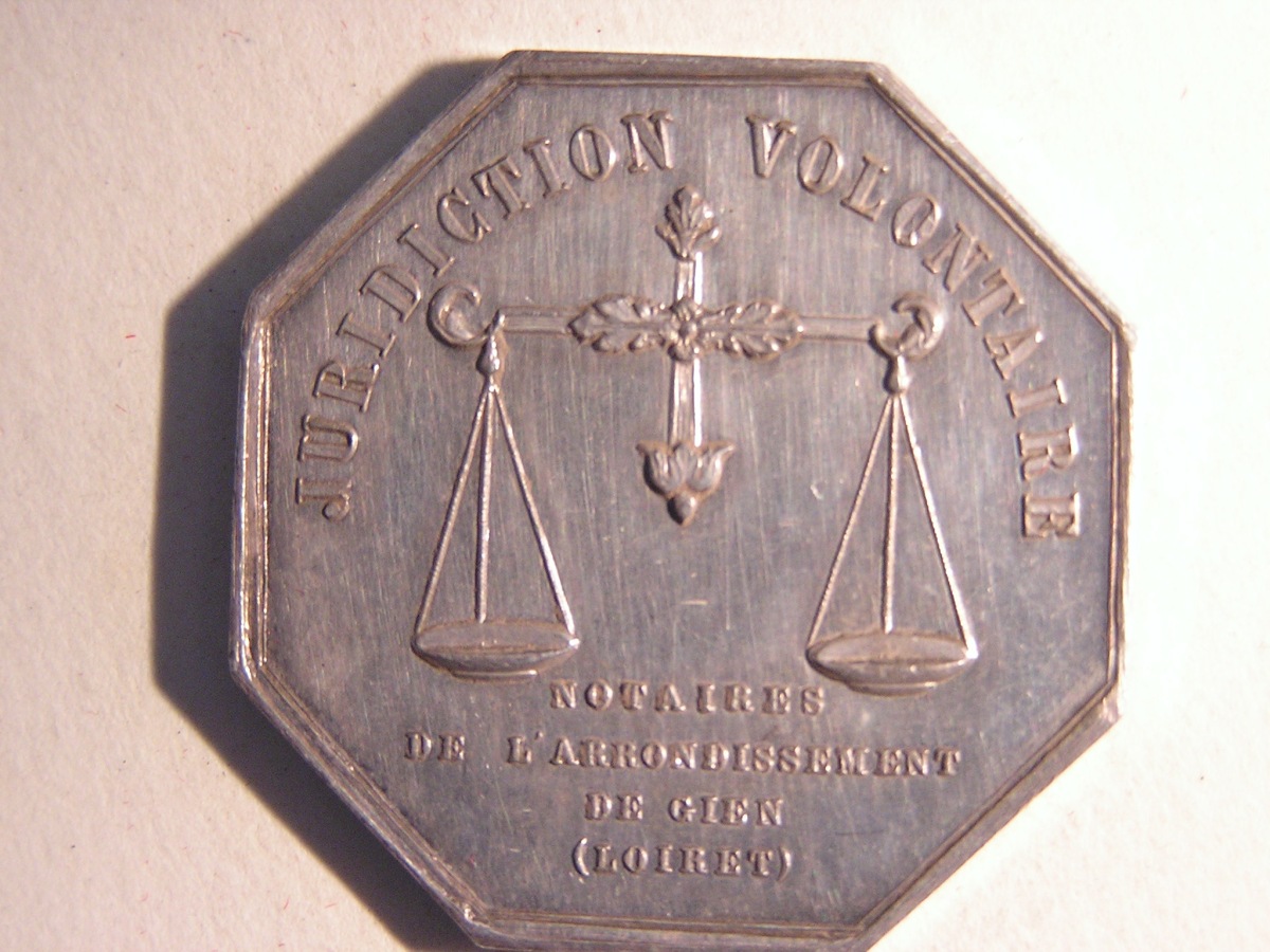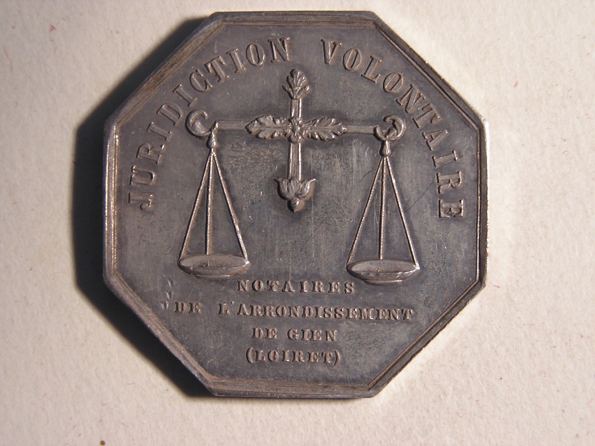 GIEN. 5 Jetons de notaires en argent, de forme octogonale.