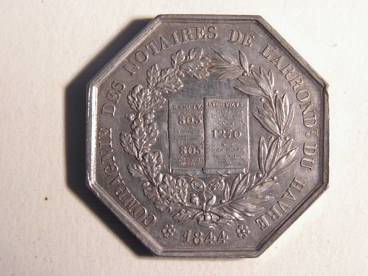 LE HAVRE. 2 Jetons de notaires en argent, de forme octogonale.