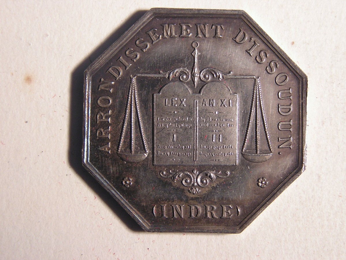 ISSOUDIN. 1 Jeton de notaire en argent, de forme octogonale.
