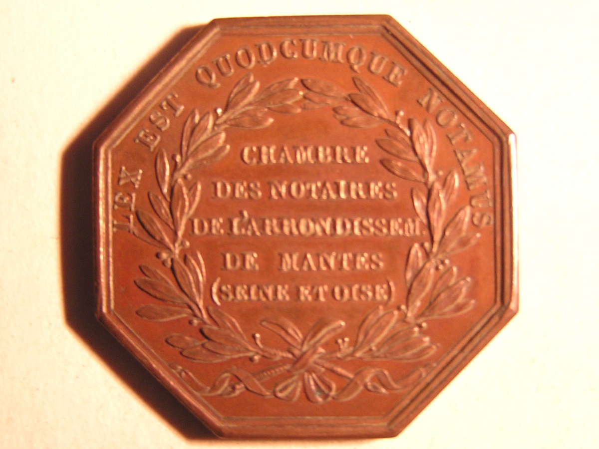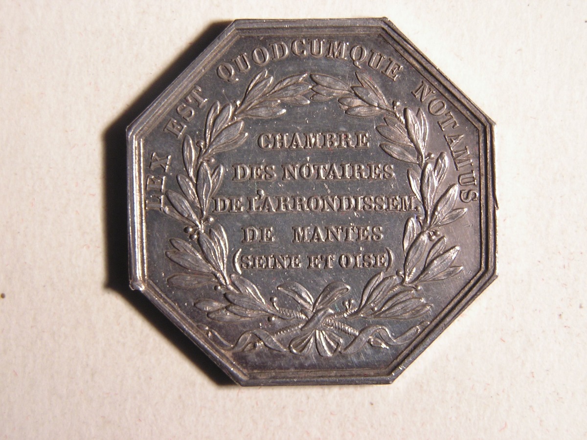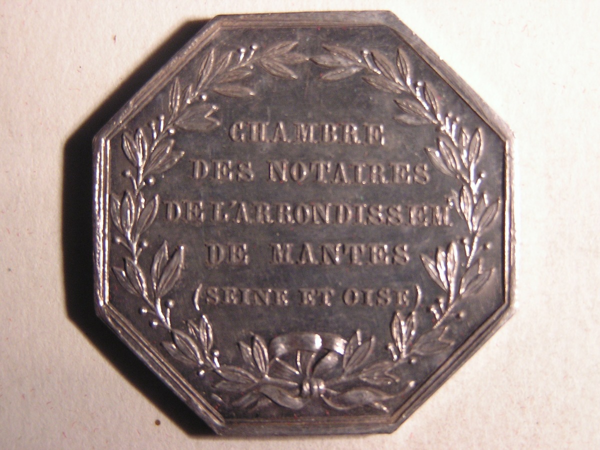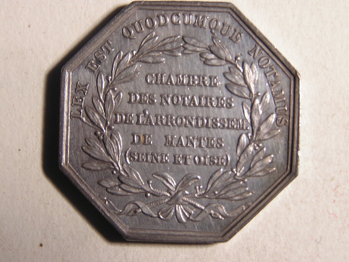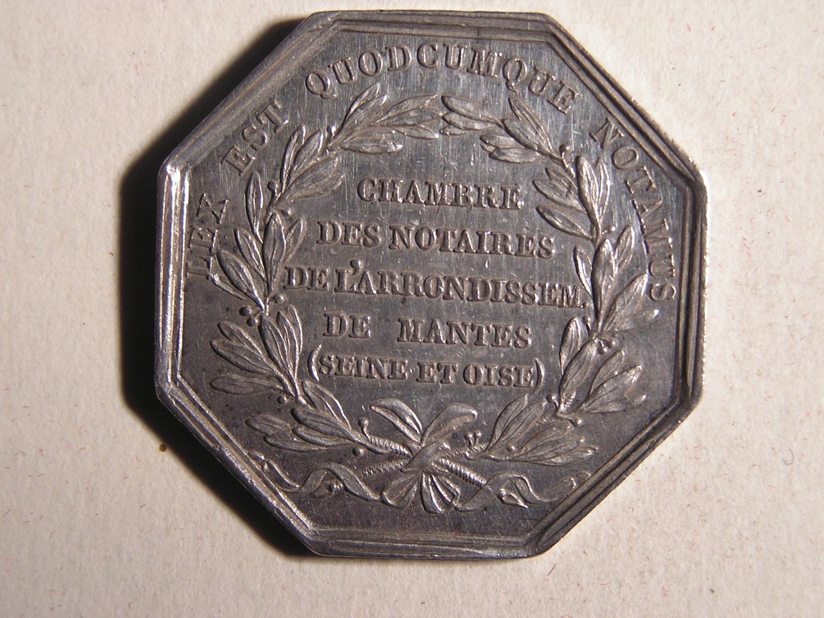 MANTES. 7 Jetons de notaires en argent et cuivre, de forme octogonale.