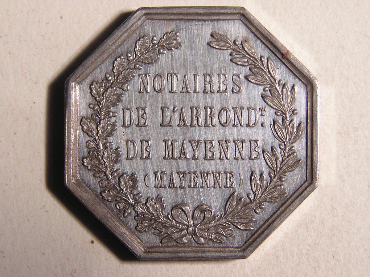 MAYENNE. 1 Jeton de notaire en argent, de forme octogonale.