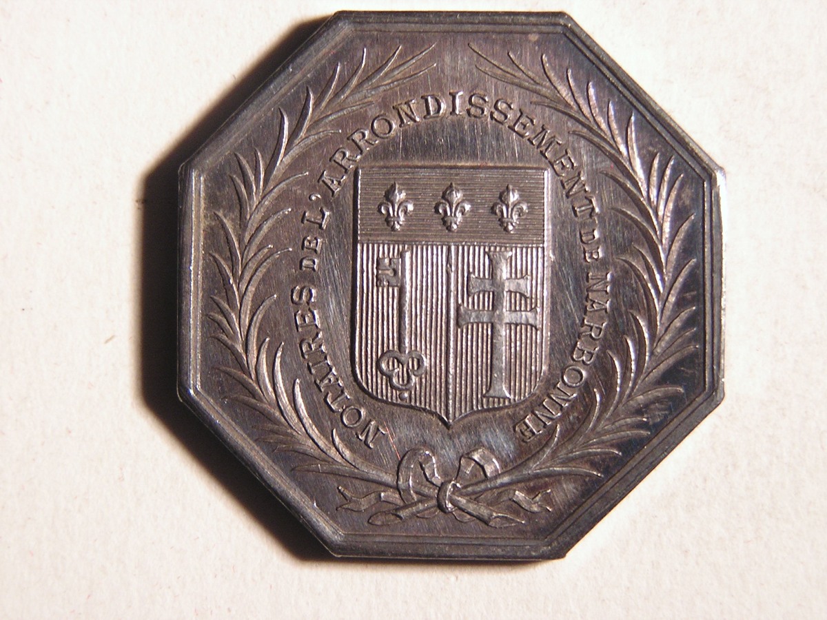 NARBONNE. 2 Jetons de notaires en argent, de forme octogonale.
