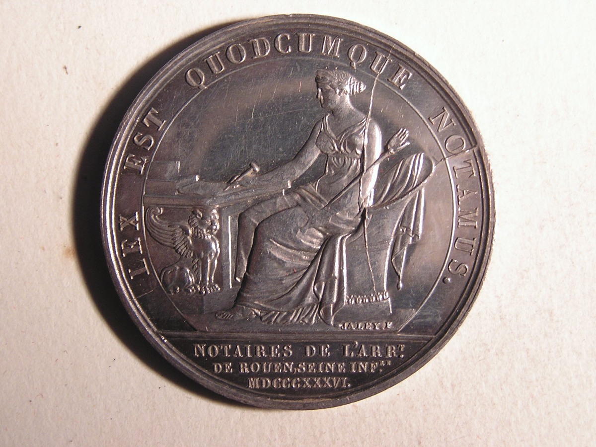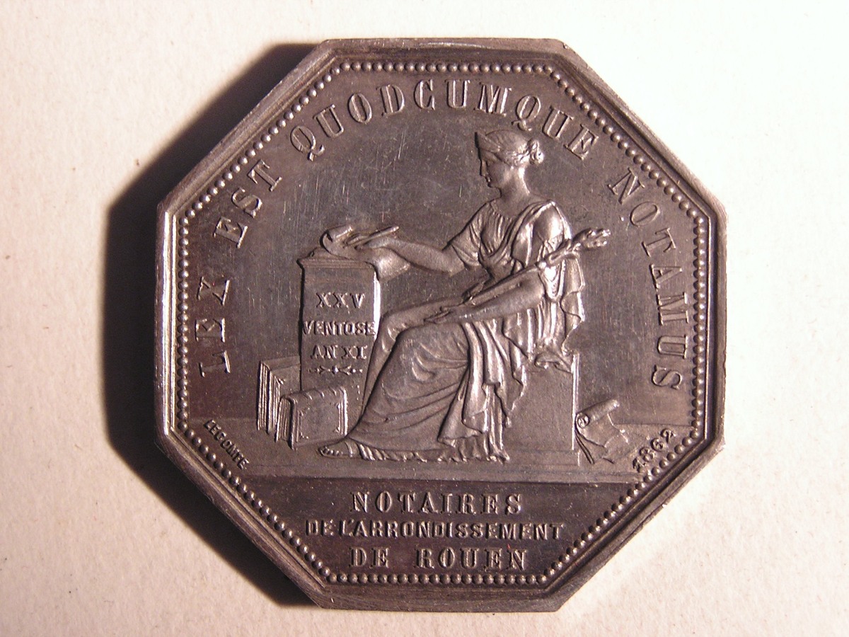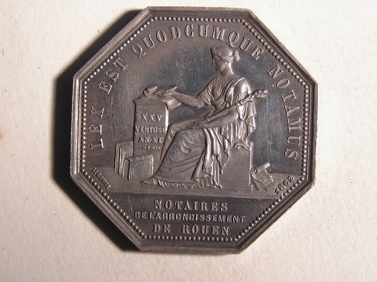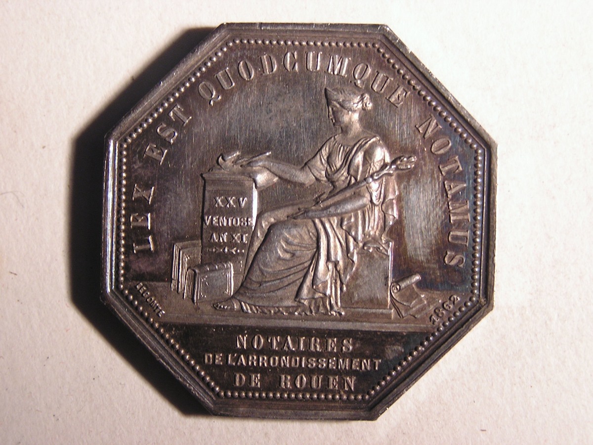 ROUEN. 7 Jetons de notaires en argent, de forme octogonale et ronde.