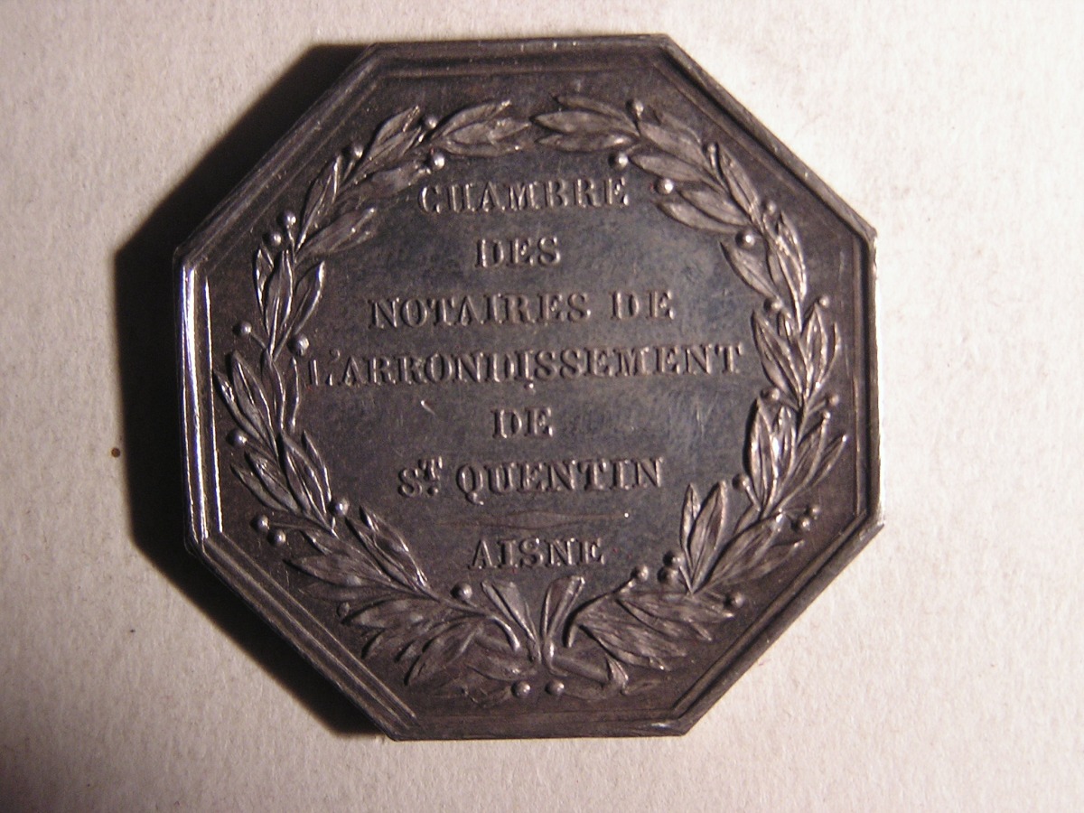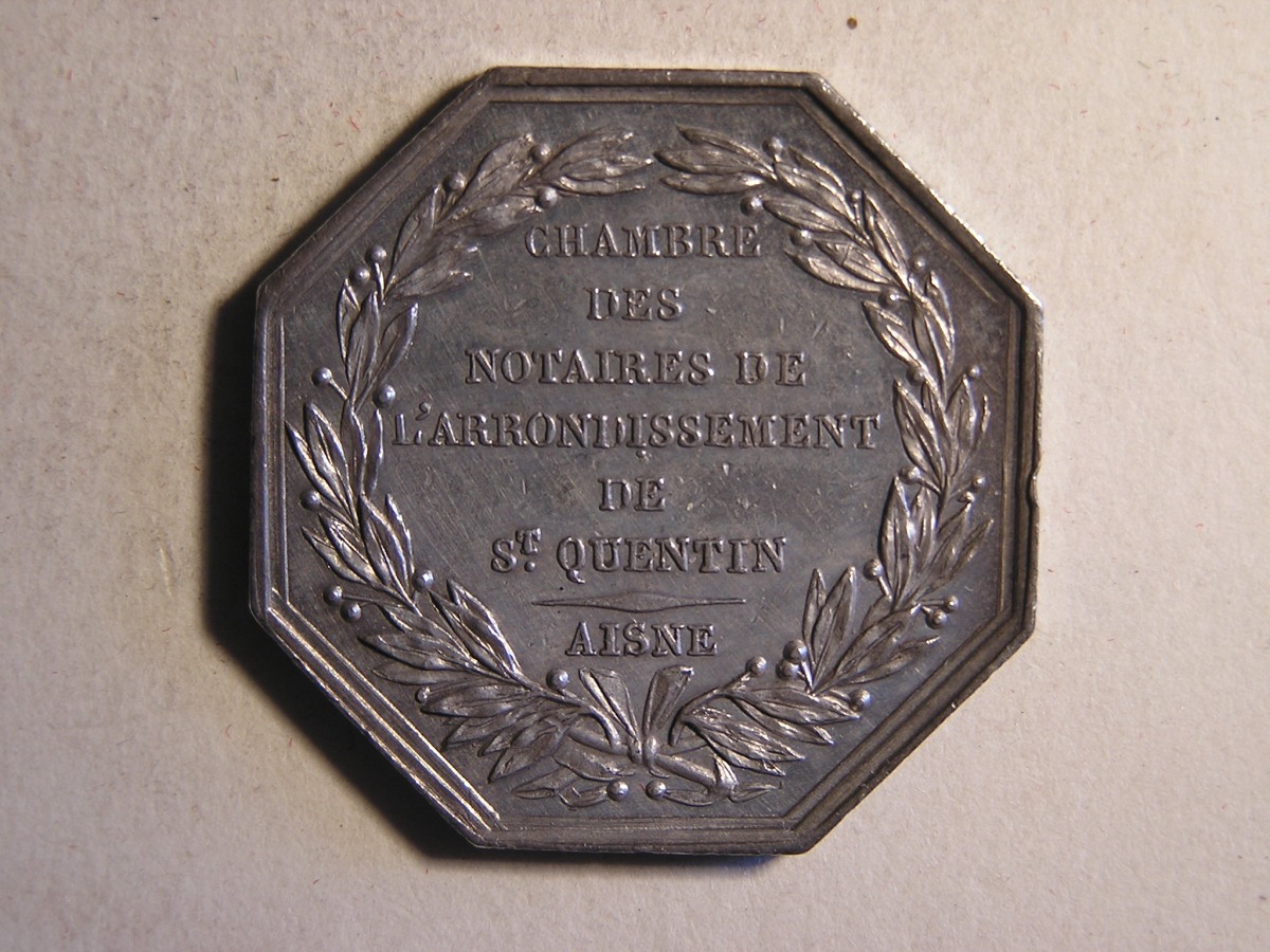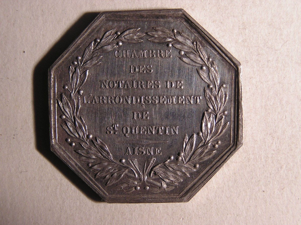SAINT QUENTIN. 5 Jetons de notaires en argent, de forme octogonale et ronde.