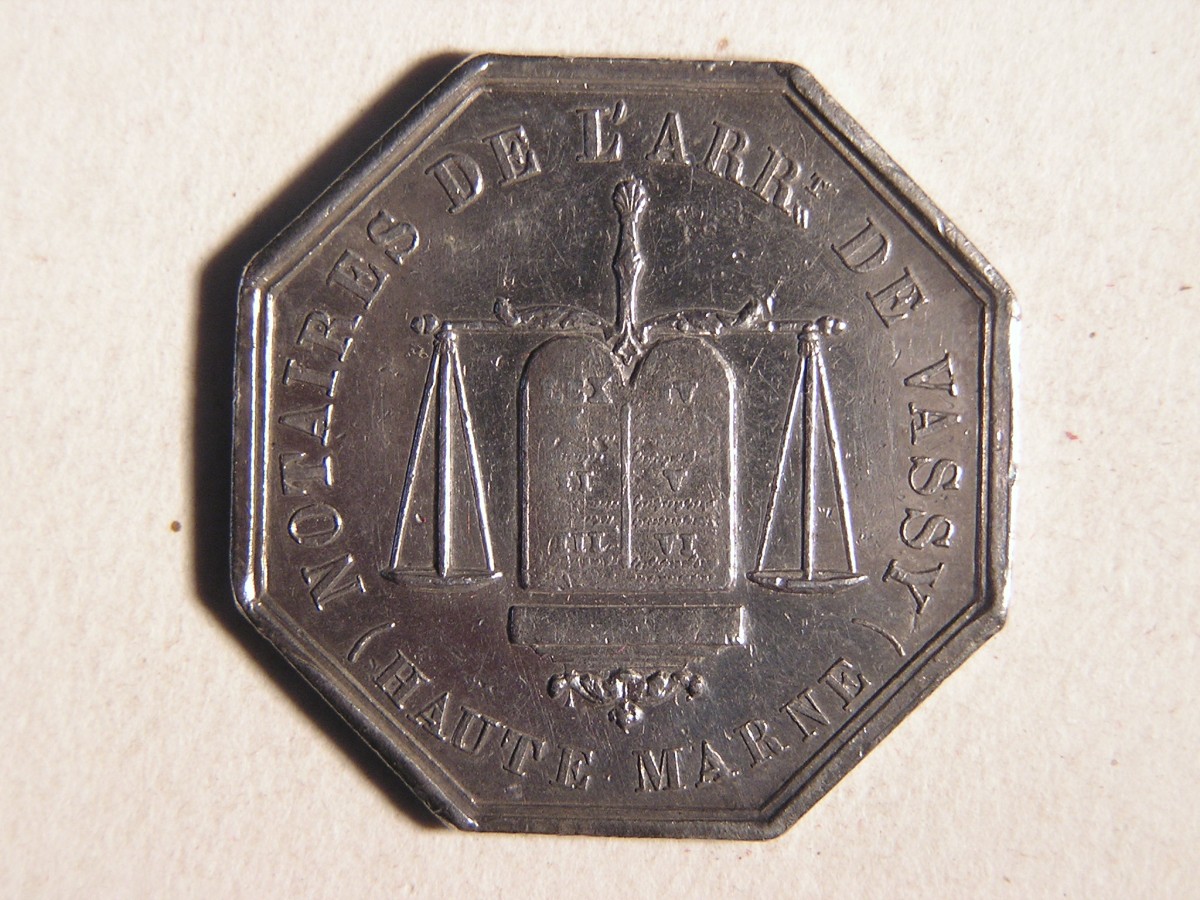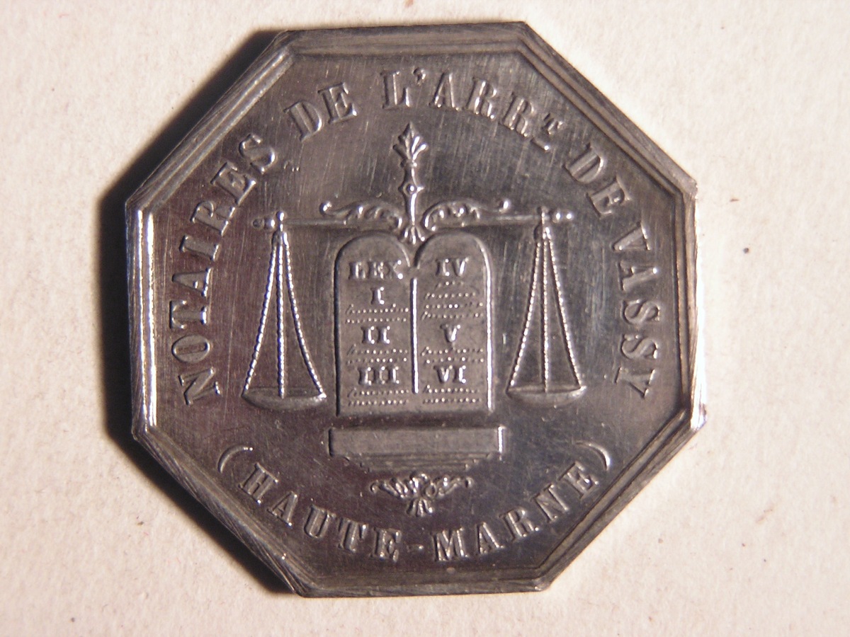 VASSY. 2 Jetons de notaires en argent, de forme octogonale.