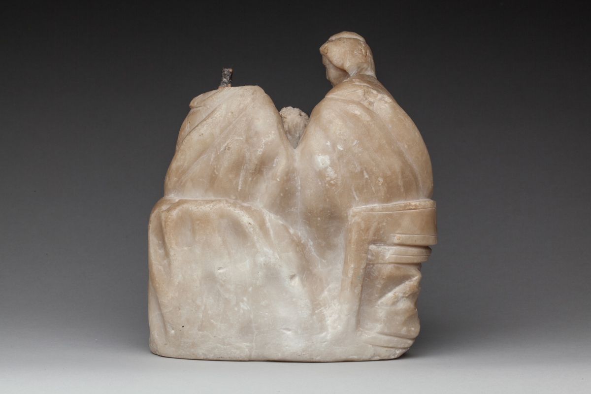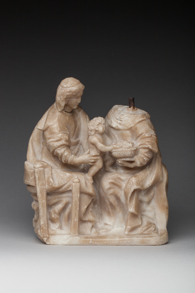 SAINTE FAMILLE. Groupe en albâtre sculpté représentant le Christ enfant sur les genoux de la Vierge choisissant un fruit dans une corbeille que lui tend Saint-Joseph.