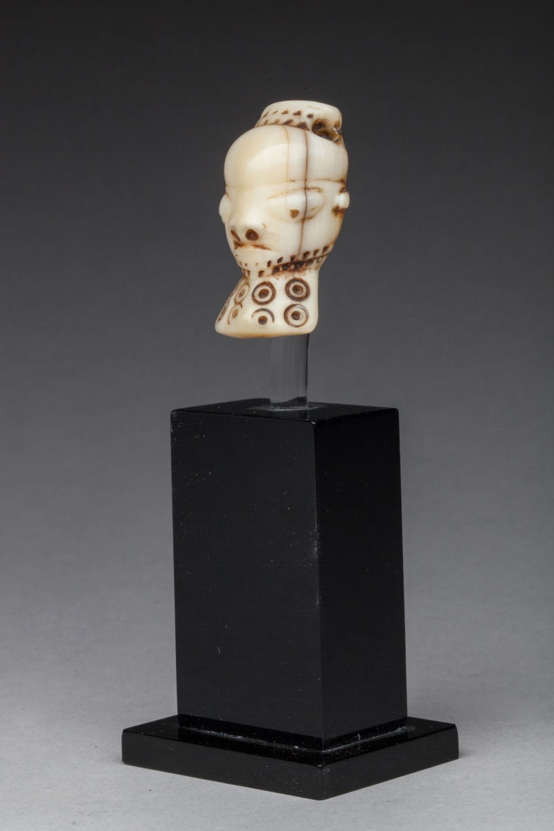"IKHOKO" en ivoire à patine blonde, représentant le masque "Muyombo" à barbe décorée de cercles-points, deux trous de suspension.