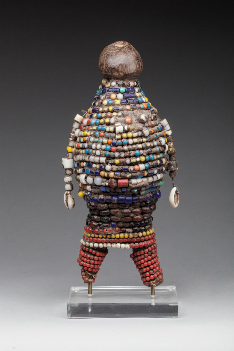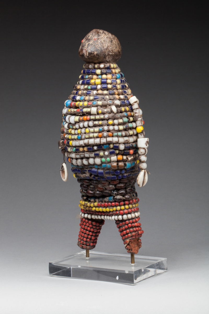 La parure de perles est collée au corps en bois, les bras représentés par deux tubes de perles.