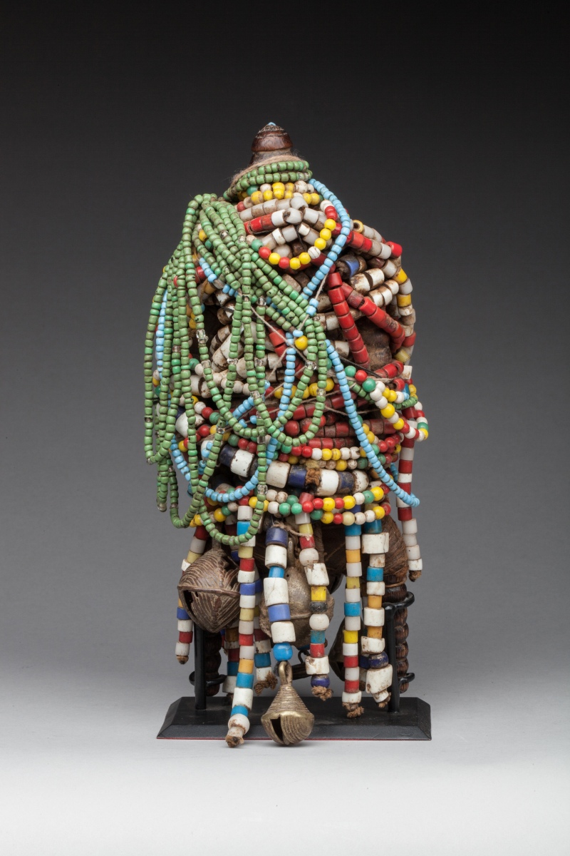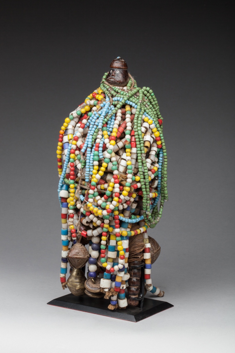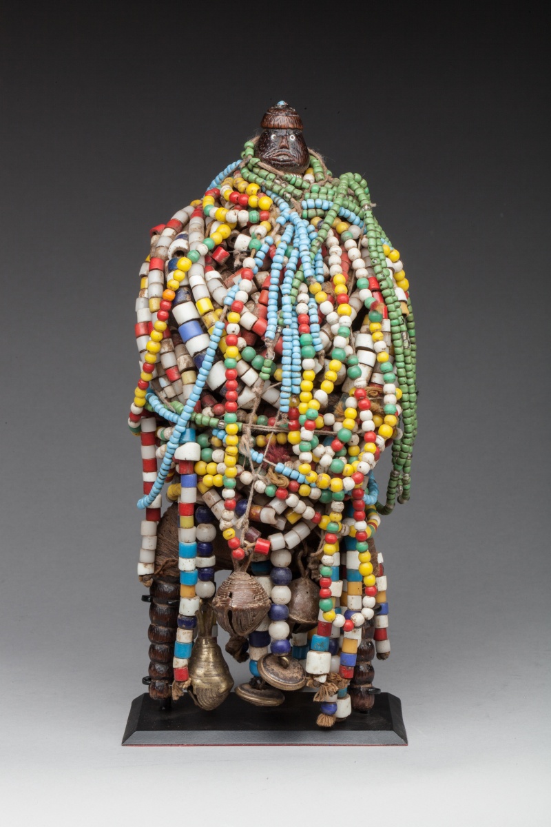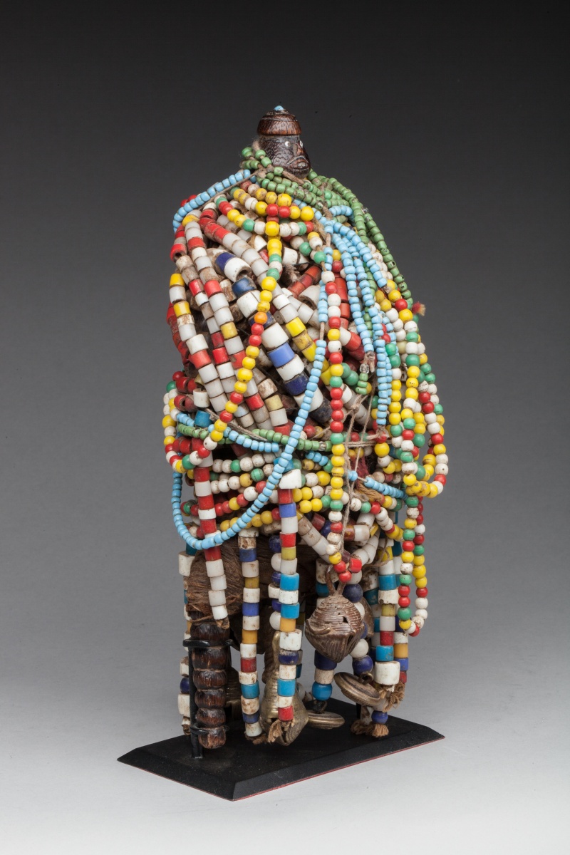 Le corps en bois enveloppé de tissu et de cuir, enfoui sous une parure de perles multicolores. Grelots, boutons de marine anglais et français. Bonne patine ancienne, jambes annelées.