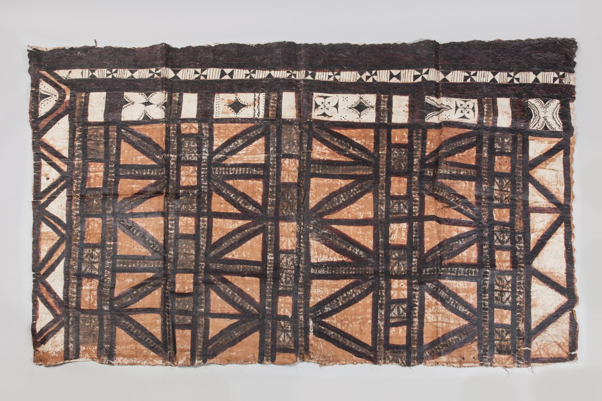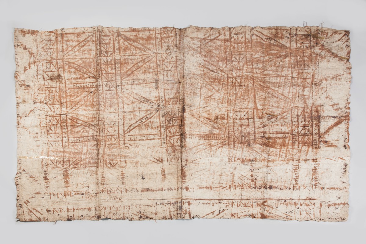 TAPA confectionné avec le liber de l'écorce de l'arbre à pain ou du mûrier de Chine, peint avec des teintures naturelles rouges, brunes et noires.