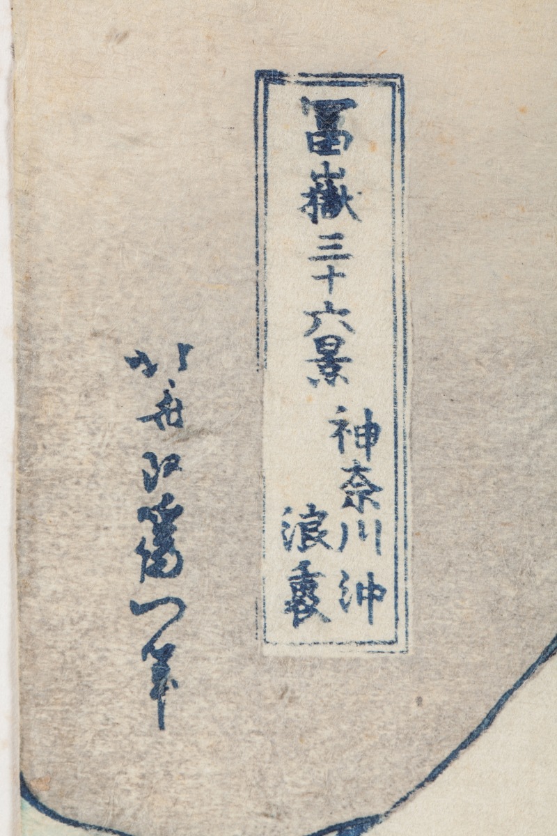 Oban yoko-e de la série "Fugaku sanjurokkei", les 36 vues du Mont Fuji, planche "Kanagawa-oki nami-ura", la grande vague à Kanagawa. Signé Hokusai aratame Iitsu hitsu. (pliure).