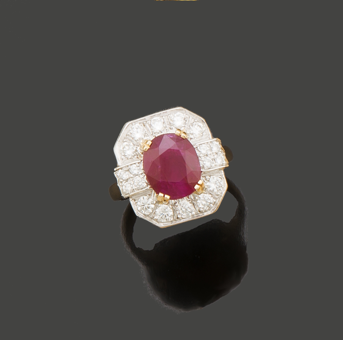 BAGUE de forme rectangulaire à pans coupés en or de deux tons ornée au centre d'un rubis taille ovale d'environ 4 carats dans un un entourage de 18 diamants taille moderne.