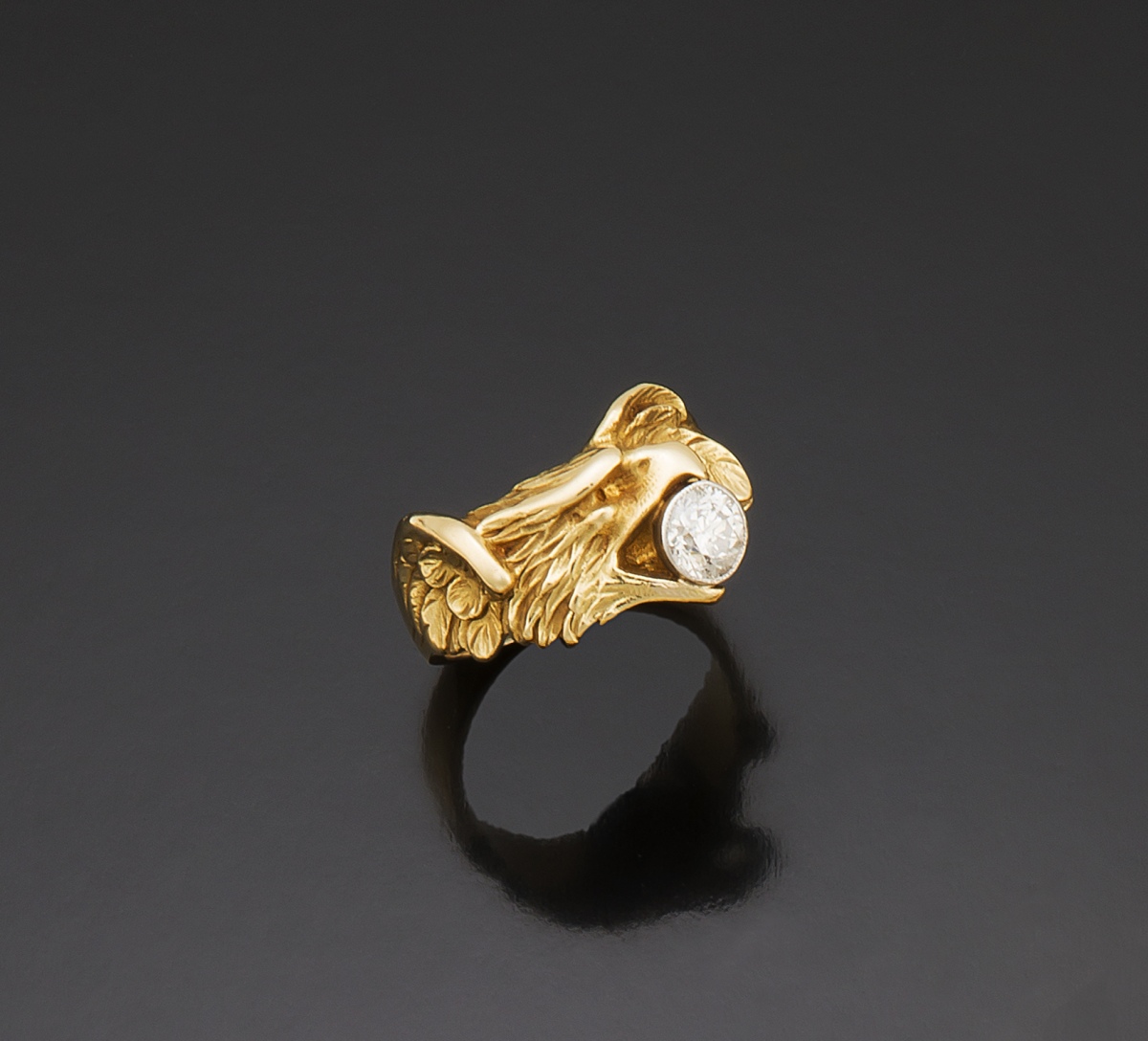 BAGUE en or jaune 18K gravé, figurant une tête d'aigle retenant un diamant rond demi taille serti clos.