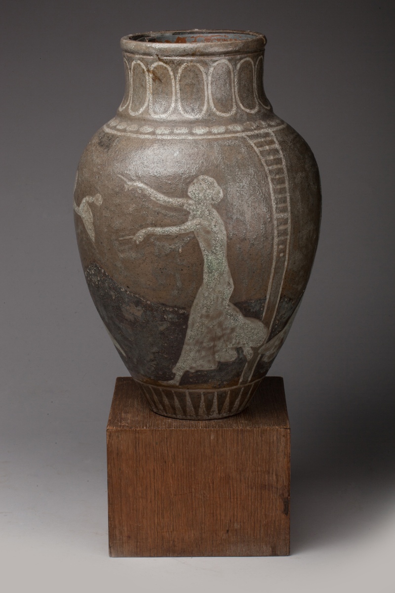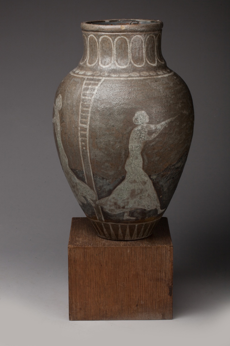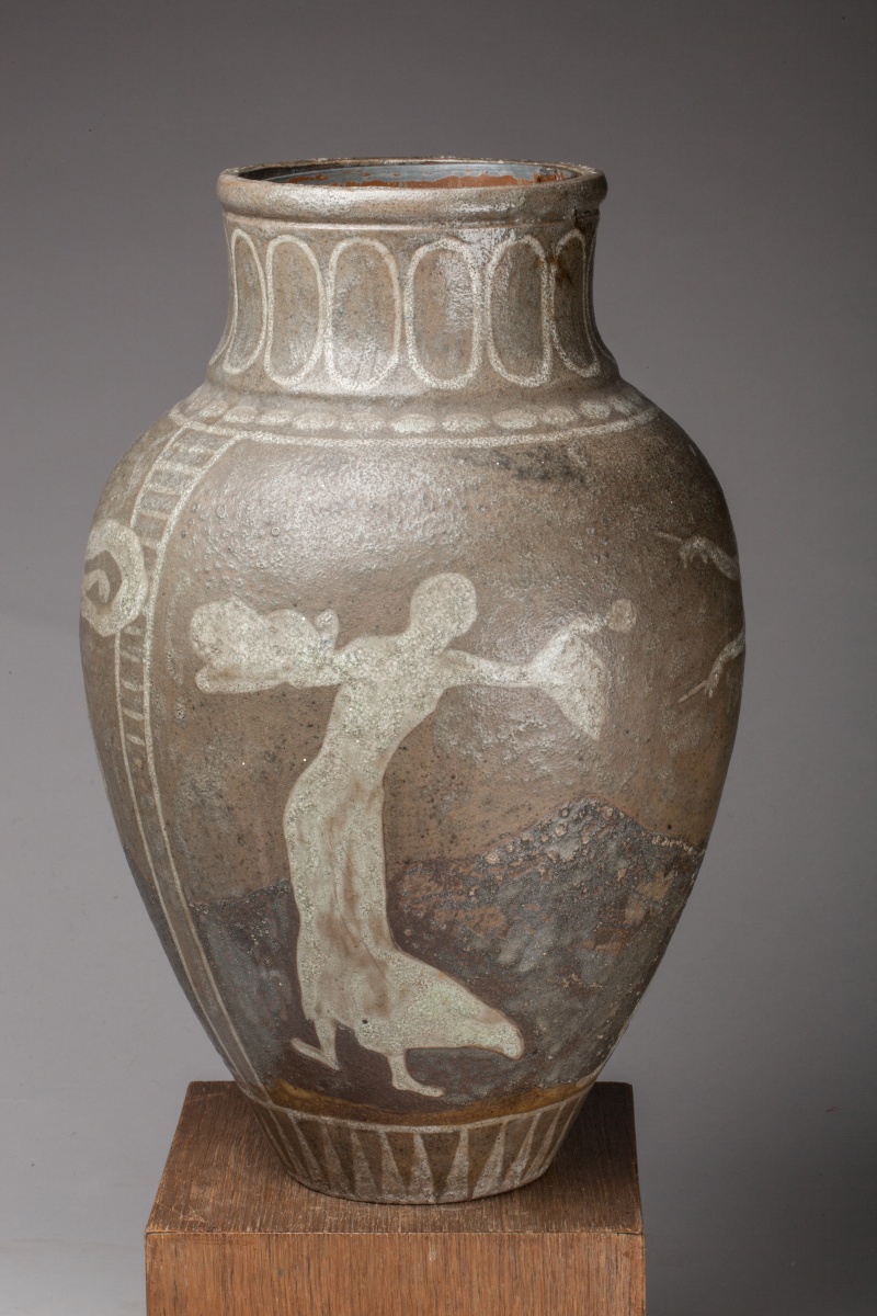 de forme balustre et pansu en grès, à décor de quatre danseuses blanches sur fond montagneux sombre. Frise de godrons sur le col, et triangulaire à la base. Numéroté "N 321 X" et signé au dessous. Sur un SOCLE rectangulaire en chêne cérusé.