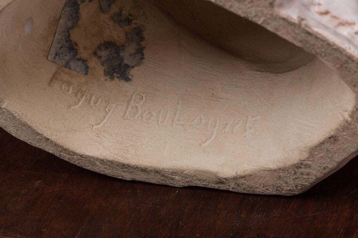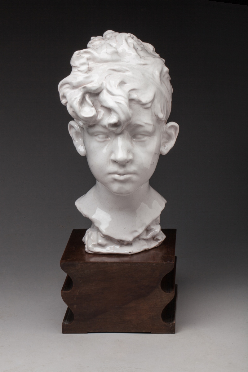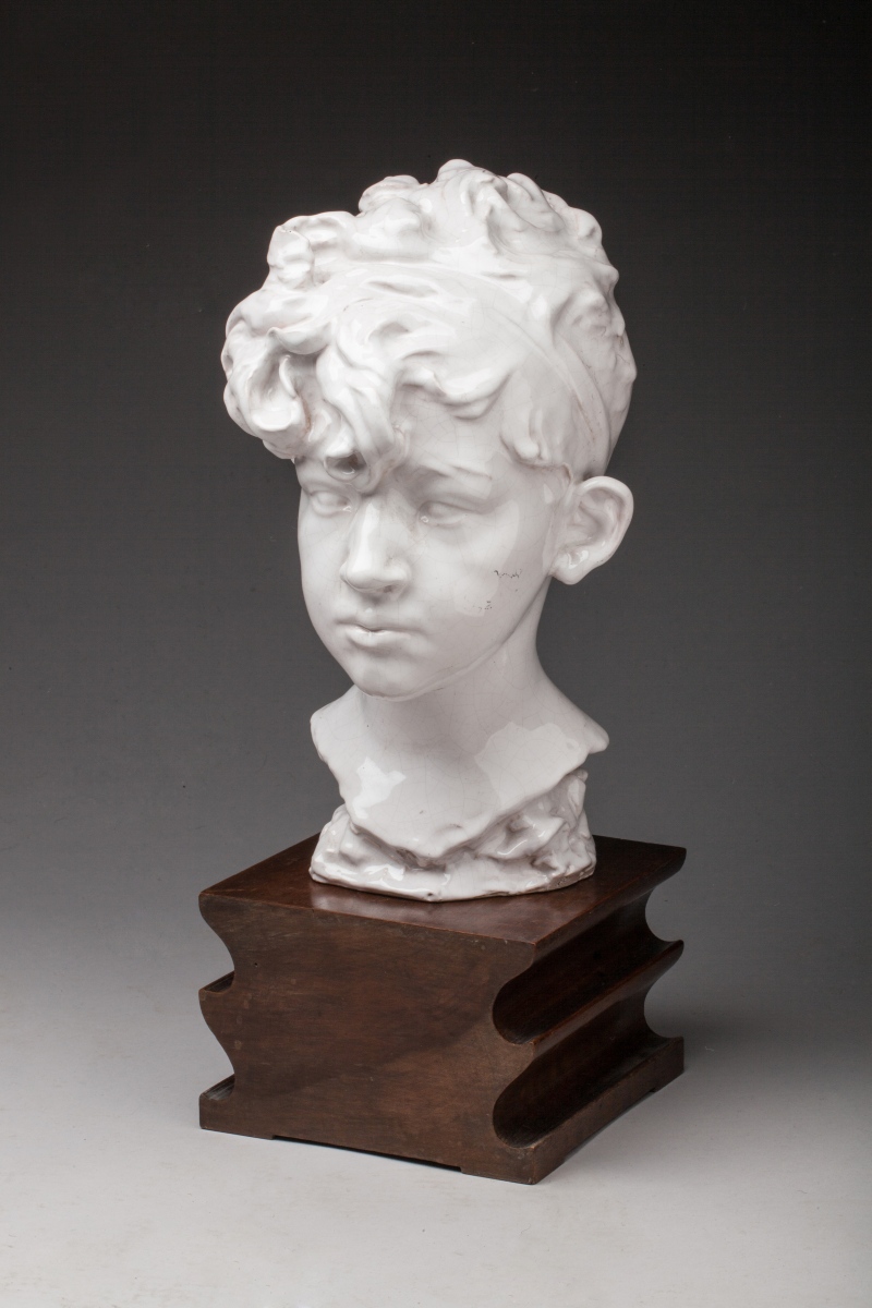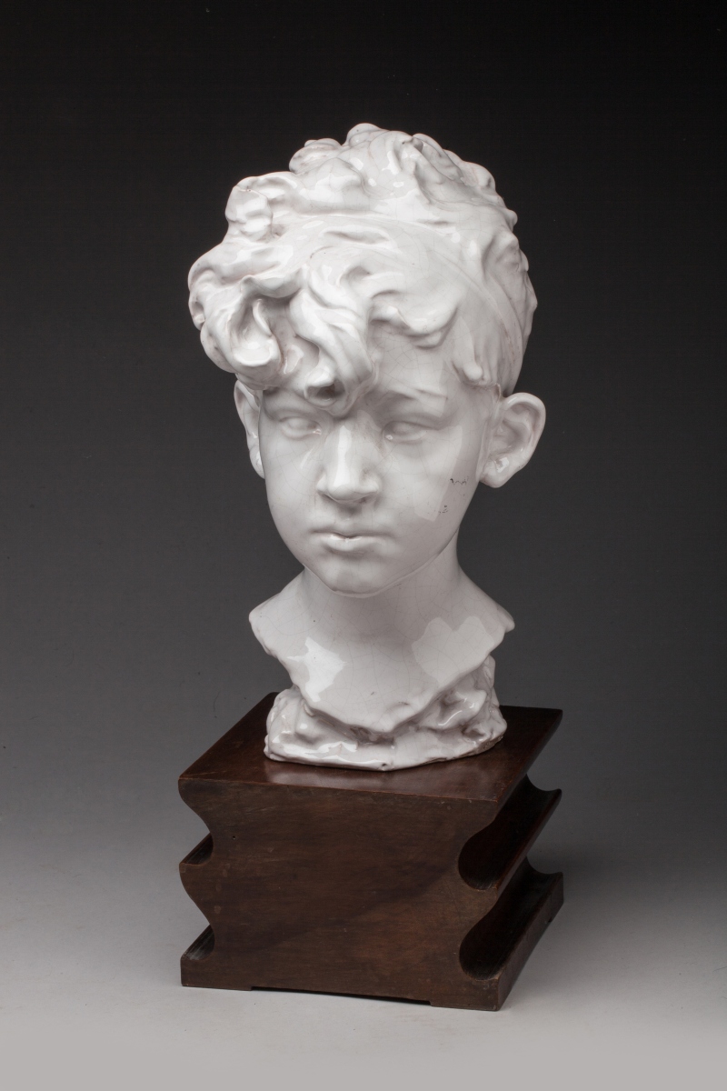 TÊTE d'ENFANT en terre cuite émaillée blanche, signée à l'intérieur "FauGui", située "Boulogne" et titrée "Lochse", sur un SOCLE en noyer à trois doucines cannelées.