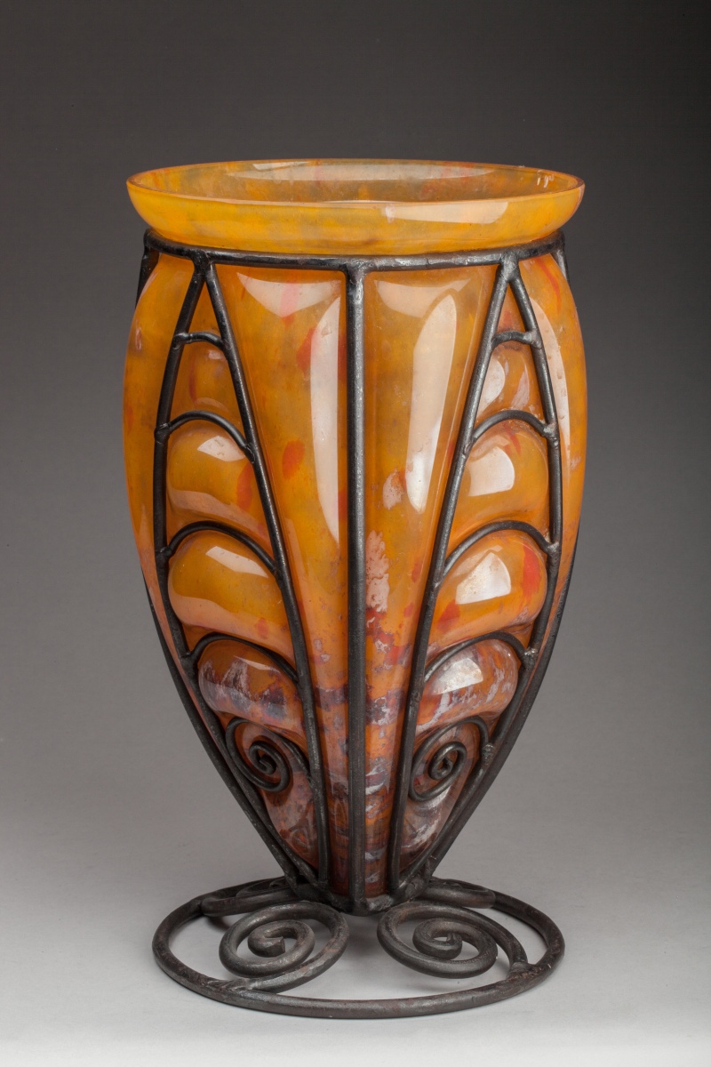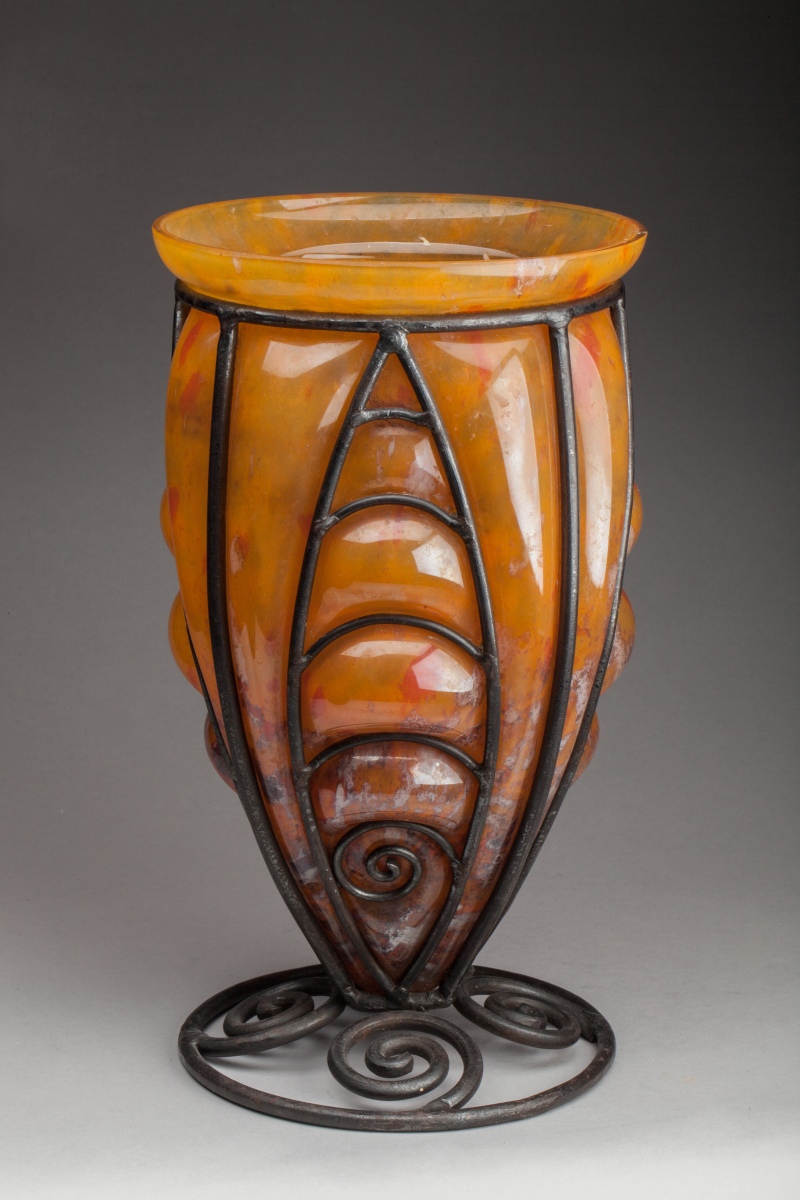 VASE à FERRONERIE en verre jaune-orangé jaspé de rouge soufflé dans une armature de fer forgé.