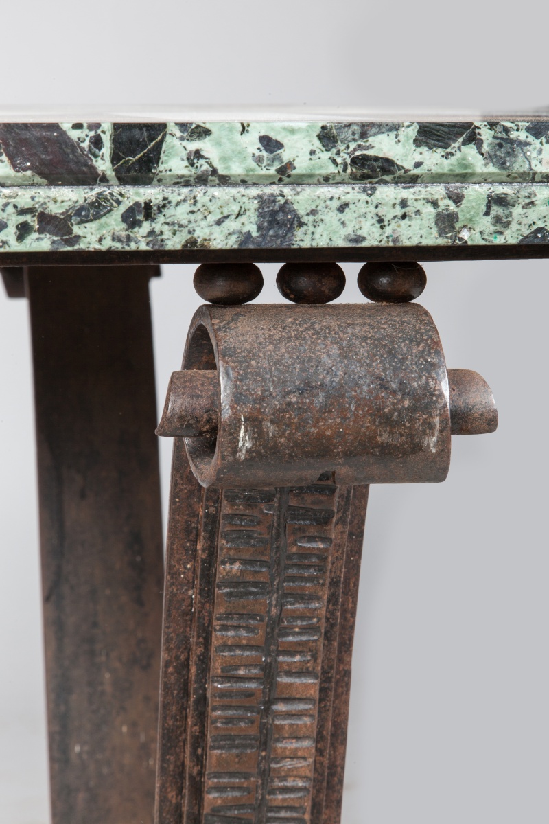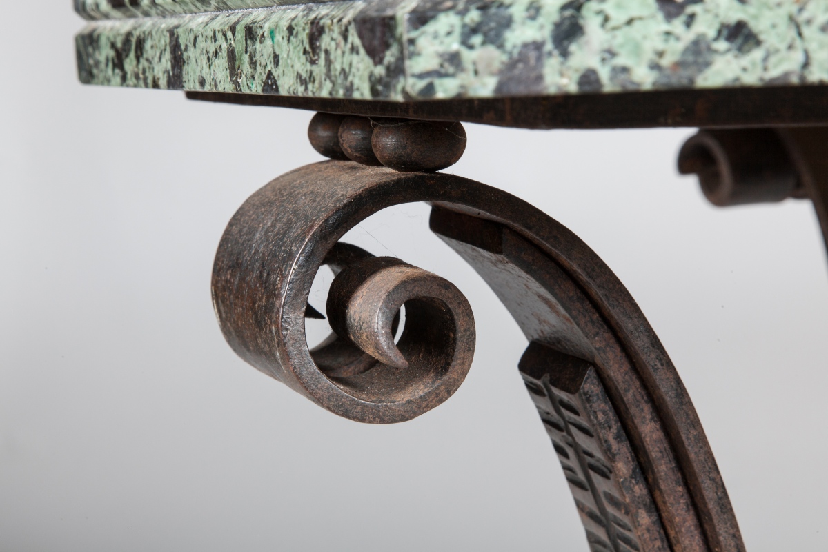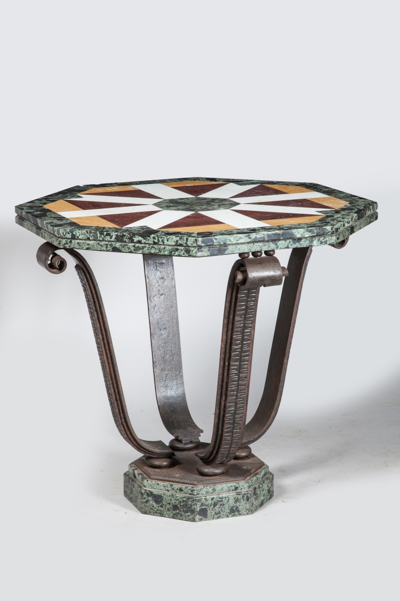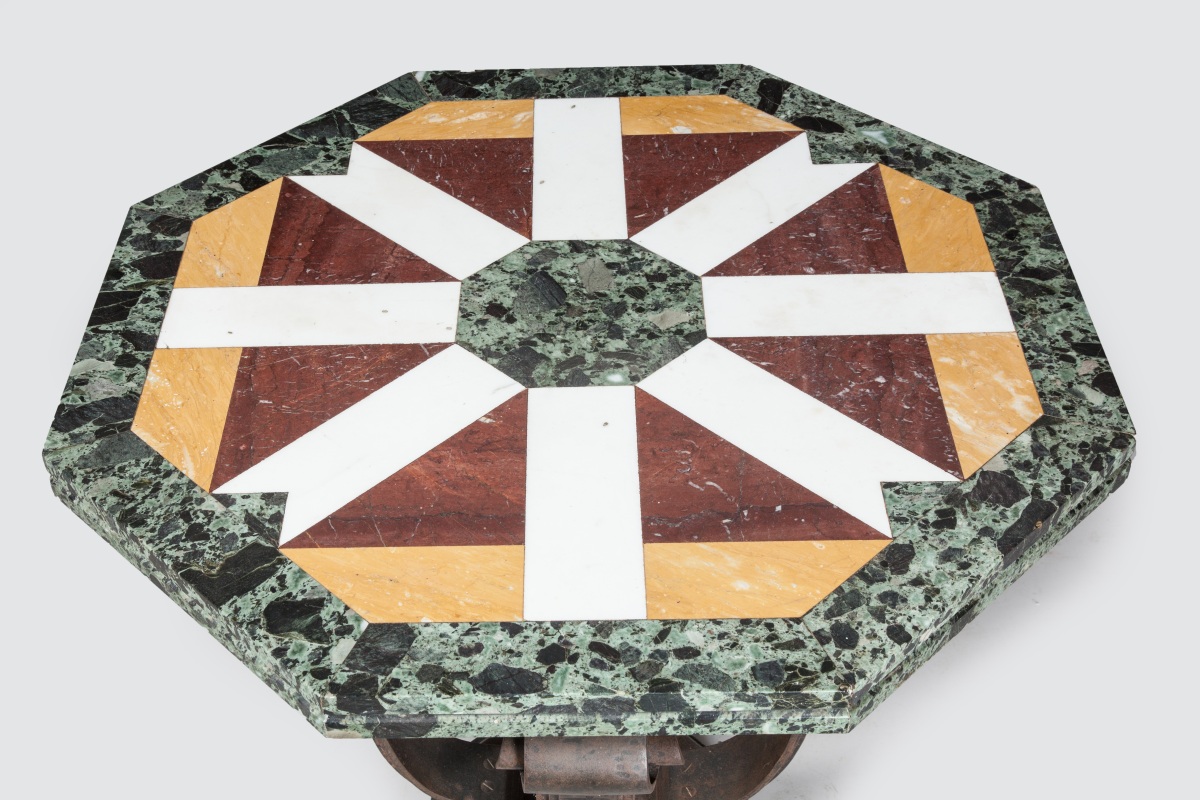 GUÉRIDON à PLATEAU de forme octogonale en marqueterie de marbre et piétement en fer forgé. Le plateau à décor géométrique rayonne d'une étoile blanche sur fond rouge, en réserve jaune sienne, à l'intérieur bordure vert de mer. Le piètement est constitué de quatre consoles à enroulement surmontées de trois billes. Chaque console est réunie à une platine centrale via une boule aplatie, le tout posé sur un petit plateau en marbre vert de mer de forme octogonale.