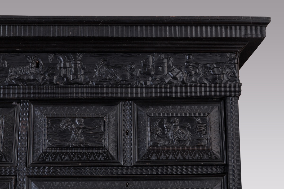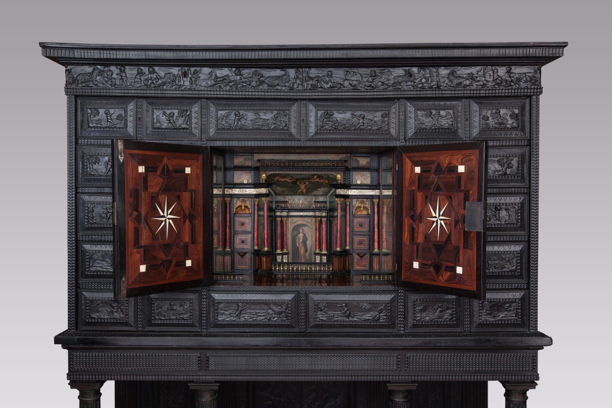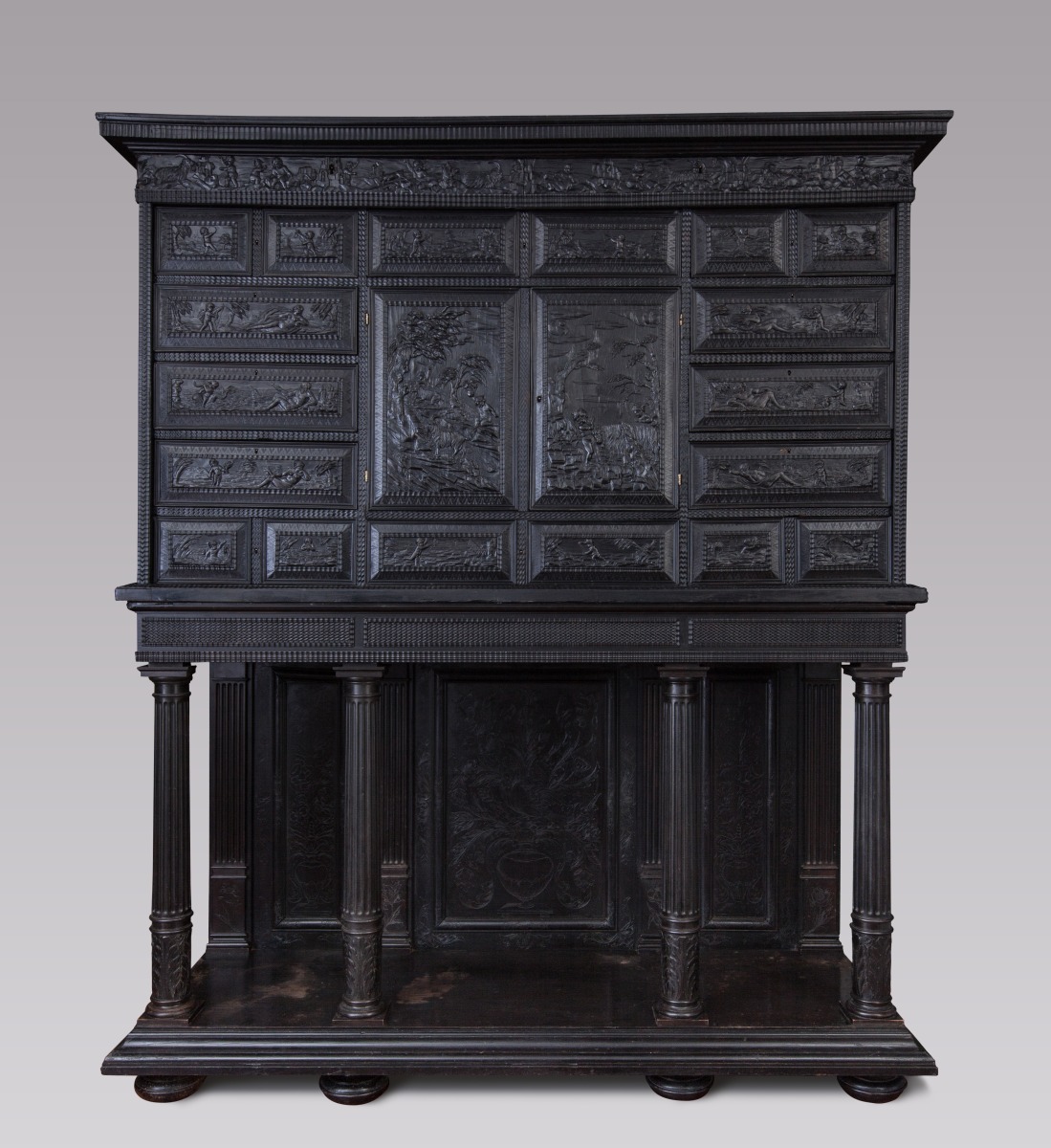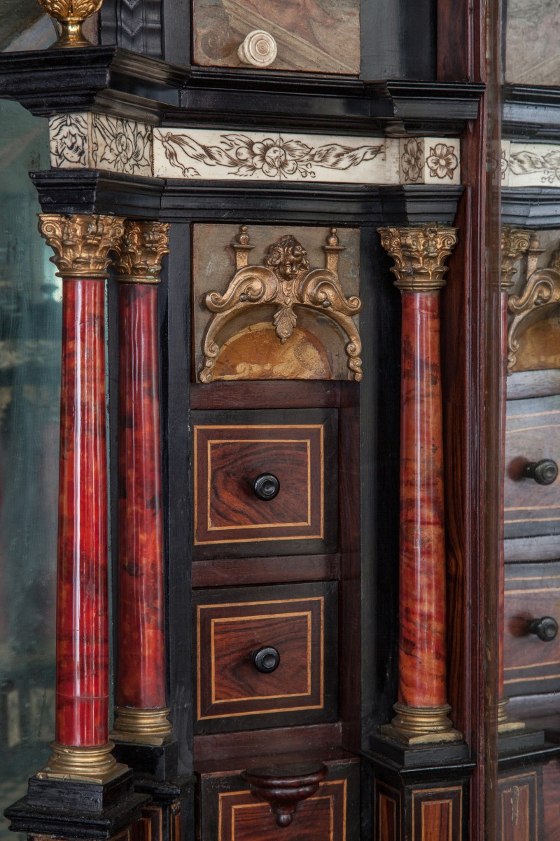 de forme rectangulaire en placage d'ébène et de bois noirci sur âme de chêne et de résineux, richement sculpté en bas-relief et gravé de scènes animées d'amours et de putti. Il présente en façade deux vantaux encadrés de 12 tiroirs sur cinq étages et deux tiroirs dans la corniche, dans un entourage de moulures ondées. Les vantaux s'ouvrent sur un théâtre. Les côtés sont gravés de motifs floraux et animaliers.