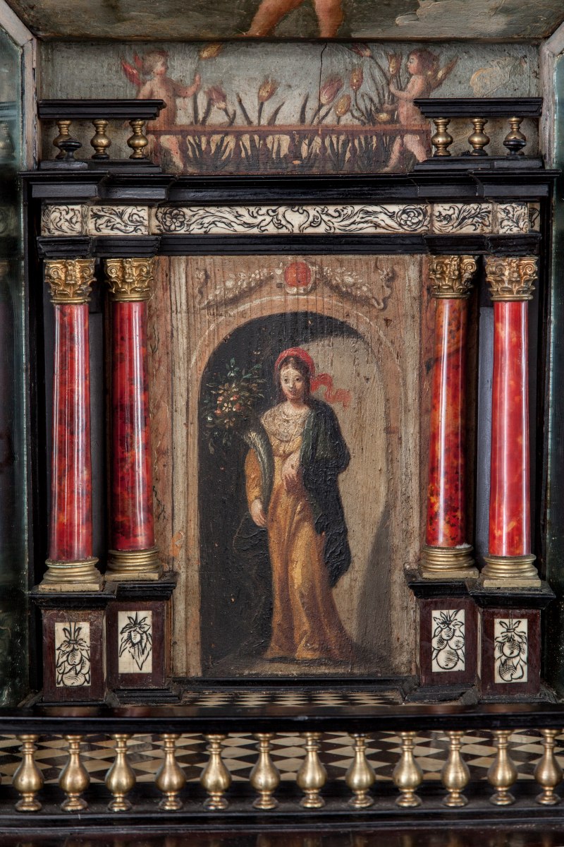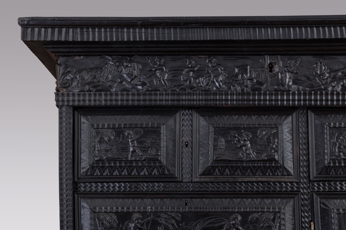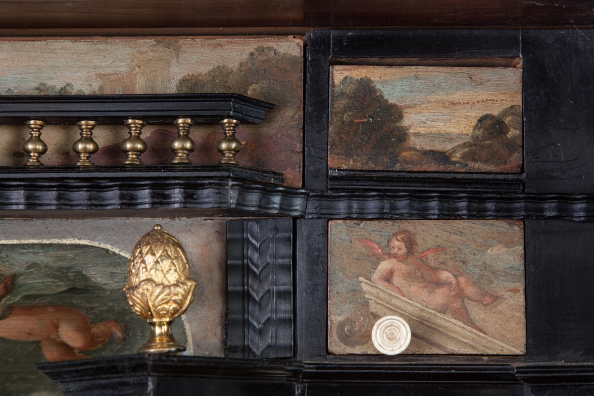 Les deux vantaux sont sculptés d'enfant gardant des chèvres, d'après une œuvre de François DUQUESNOY. Le revers des vantaux à décor en marqueterie de bois précieux et d'ivoire d'une rose des vents dans un encadrement géométrisant.
