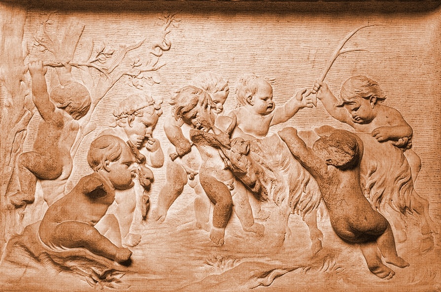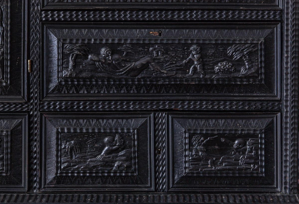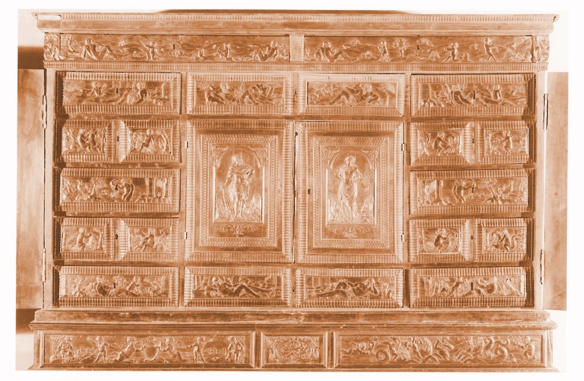 Les six tiroirs flanquant les vantaux présentent des amours et des putti au service de nymphes et des Dieux de l'Olympe : Vénus, Neptune, Cérès et Bacchus. Les six tiroirs des rangées du haut et du bas présentent deux registres dans lesquels s'amusent des enfants avec des instruments de musique, chassant à l'arbalète, faisant tourner un moulin à vent, domptant une chèvre, se baignant, tirant à la fronde ou encore effrayant un animal avec un masque. Les deux tiroirs de la corniche sont ornés d'une frise d'enfants jouant et gardant des chèvres.