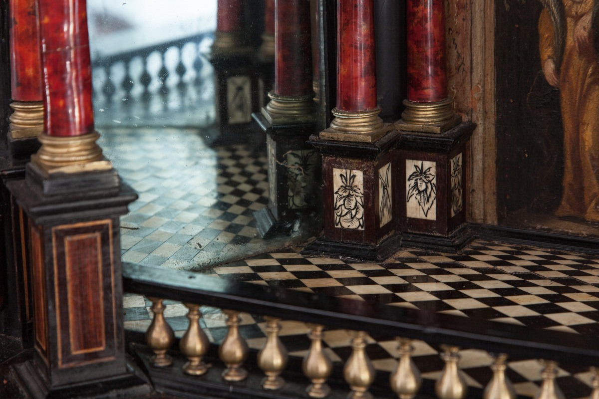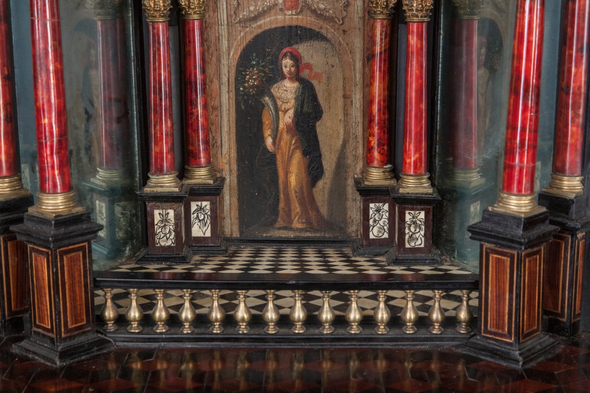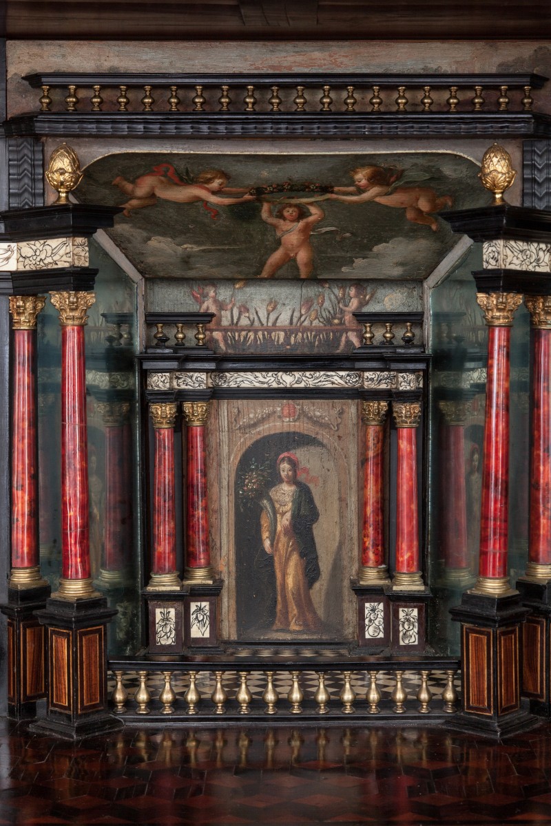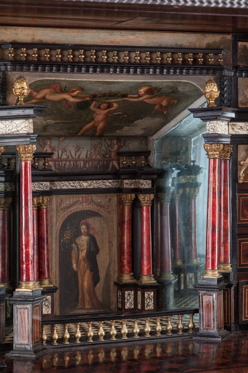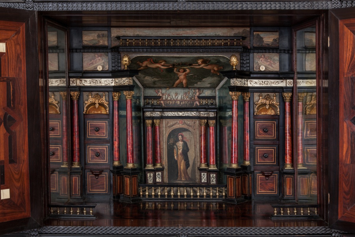 Le théâtre intègre 13 tiroirs, tantôt peints, tantôt marquetés de bois précieux, dans une architecture ornée d'ivoire gravé et de balustrades. 10 colonnes (dont deux en demi) plaquées d'écaille rouge, les chapiteaux et bases en bronze doré, se reflètent dans un jeu de miroirs. La partie centrale du caisson, marquetée d'un damier et de cubes, simule une perspective de palais accentuée par deux miroirs. Elle est agrémentée de trois panneaux peints. Celui du fond figurant l'allégorie de l'Abondance est sommée de deux Amours portant des tulipes. Le plafond de forme trapézoïdale reçoit trois putti élevant une couronne de fleurs.
