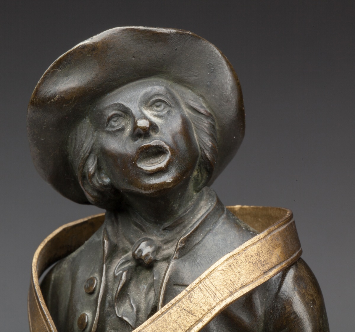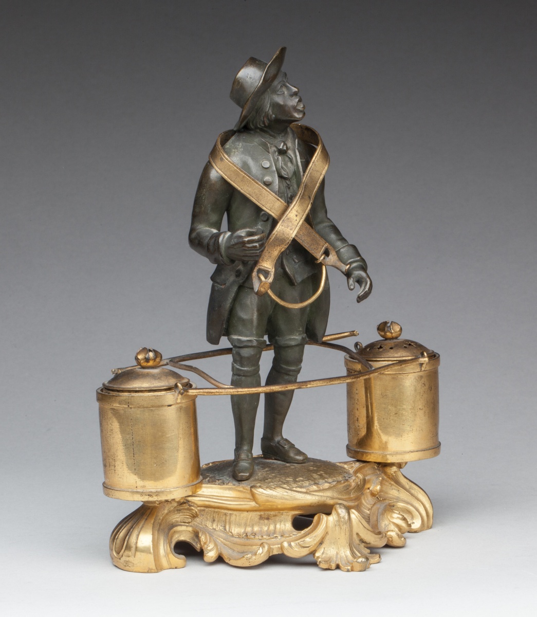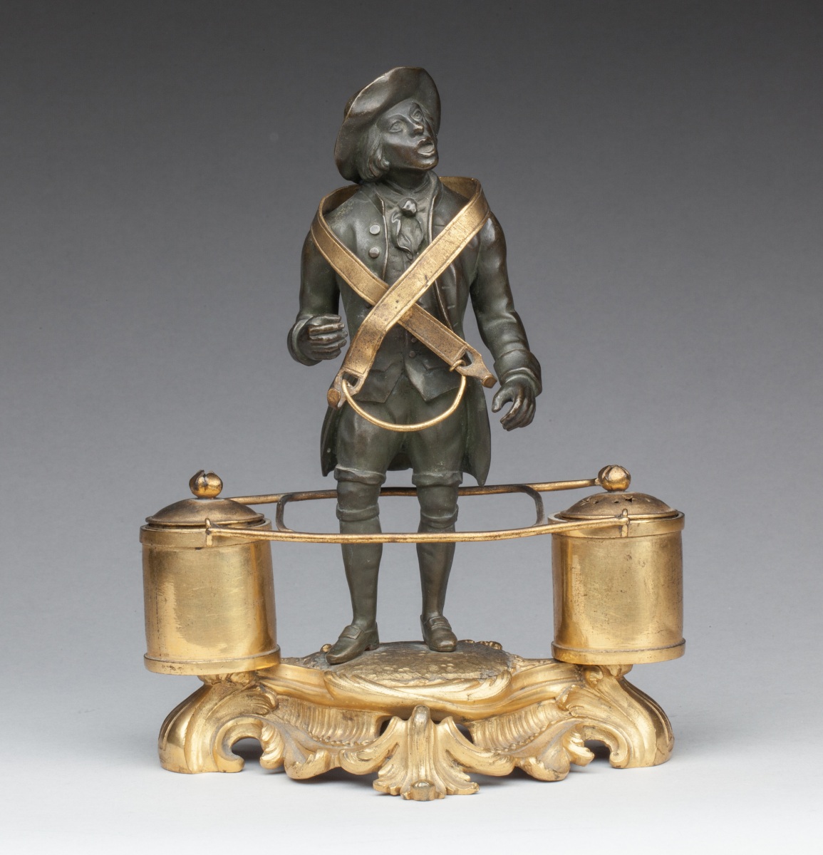 ÉCRITOIRE en bronze ciselé et doré et bronze patiné figurant un PORTEUR d'EAU. Les réceptacles de forme cylindrique contenant, l'un le sablier, l'autre l'encrier. Il repose sur une base oblongue ornée de feuilles d'acanthe stylisées. Godets en verre.